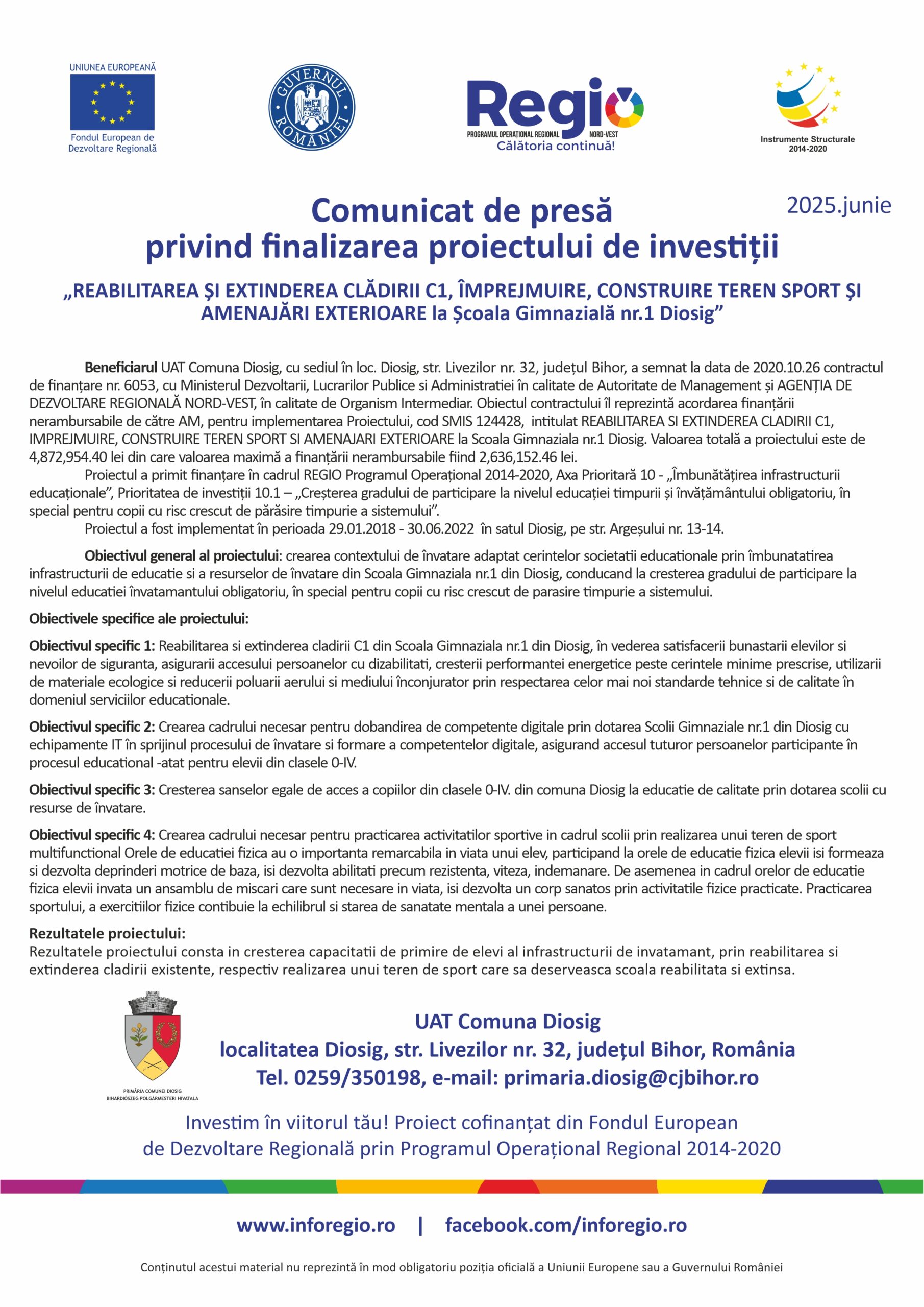 Beneficiarul UAT Comuna Diosig, cu sediul în loc. Diosig, str. Livezilor nr. 32, judeţul Bihor, a semnat la data de 2020.10.26 contractul de finanţare nr: 6053, cu Ministerul Dezvoltarii, Lucrarilor Publice si Administratiei în calitate de Autoritate de Management şi AGENŢIA DE DEZVOLTARE REGIONALĂ NORD-VEST, în calitate de Organism Intermediar. Obiectul contractului îl reprezintă acordarea finanţării nerambursabile de către AM, pentru implementarea Proiectului, cod SMIS 124428, intitulat REABILITAREA SI EXTINDEREA CLADIRII C1, IMPREJMUIRE, CONSTRUIRE TEREN SPORT SI AMENAJARI EXTERIOARE la Scoala Gimnaziala nr:1 Diosig. Valoarea totală a proiectului este de 4,872,954.40 lei din care valoarea maximă a finanţării nerambursabile fiind 2,636,152.46 lei.
