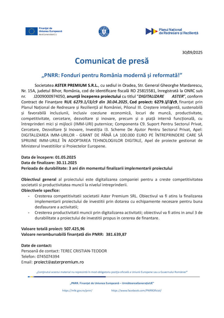 Societatea ASTER PREMIUM S.R.L., cu sediul in Oradea, Str. General Gheorghe Mardarescu, Nr. 15A, judetul Bihor, România, cod de identificare fiscală RO 25815581, înregistrată la ONRC sub nr. J2009000974050, anunță începerea proiectului cu titlul “DIGITALIZARE ASTER”, conform Contract de Finanțare RUE 6279.1/i3/c9 din 30.04.2025, Cod proiect: 6279.1/i3/c9, finanțat prin Planul Național de Redresare și Reziliență al României, Pilonul III. Creștere inteligentă, sustenabilă și favorabilă incluziunii, inclusiv coeziune economică, locuri de muncă, productivitate, competitivitate, cercetare, dezvoltare și inovare, precum și o piață internă funcțională, cu întreprinderi mici și mijlocii (IMM-URI) puternice; Componenta C9. Suport Pentru Sectorul Privat, Cercetare, Dezvoltare Și Inovare, Investiția I3. Scheme De Ajutor Pentru Sectorul Privat, Apel: DIGITALIZAREA IMM-URILOR – GRANT DE PÂNĂ LA 100.000 EURO PE ÎNTREPRINDERE CARE SĂ SPRIJINE IMM-URILE ÎN ADOPTAREA TEHNOLOGIILOR DIGITALE, Apel de proiecte gestionat de Ministerul Investitiilor si Proiectelor Europene.