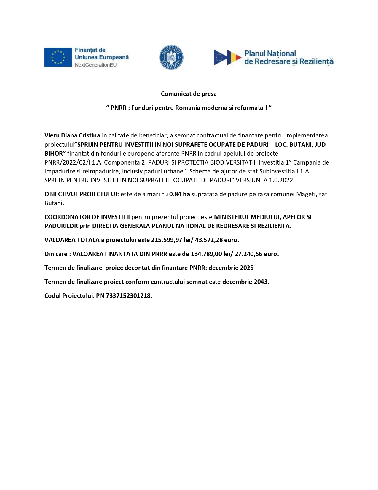 Vieru Diana Cristina in calitate de beneficiar, a semnat contractual de finantare pentru implementarea proiectului „SPRIJIN PENTRU INVESTITII IN NOI SUPRAFETE OCUPATE DE PADURI – LOC. BUTANI, JUD BIHOR” finantat din fondurile europene aferente PNRR in cadrul apelului de proiecte PNRR/2022/C2/I.1.A, Componenta 2: PADURI SI PROTECTIA BIODIVERSITATII, Investitia 1” Campania de impadurire si reimpadurire, inclusiv paduri urbane”. Schema de ajutor de stat Subinvestitia I.1.A “ SPRIJIN PENTRU INVESTITII IN NOI SUPRAFETE OCUPATE DE PADURI” VERSIUNEA 1.0.2022