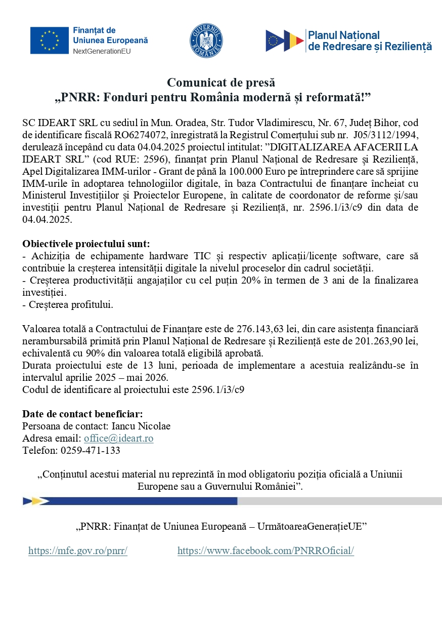 SC IDEART SRL cu sediul în Mun. Oradea, Str. Tudor Vladimirescu, Nr. 67, Județ Bihor, cod de identificare fiscală RO6274072, înregistrată la Registrul Comerțului sub nr. J05/3112/1994, derulează începând cu data 04.04.2025 proiectul intitulat: ”DIGITALIZAREA AFACERII LA IDEART SRL” (cod RUE: 2596), finanțat prin Planul Național de Redresare și Reziliență, Apel Digitalizarea IMM-urilor – Grant de până la 100.000 Euro pe întreprindere care să sprijine IMM-urile în adoptarea tehnologiilor digitale, în baza Contractului de finanțare încheiat cu Ministerul Investițiilor și Proiectelor Europene, în calitate de coordonator de reforme și/sau investiții pentru Planul Național de Redresare și Reziliență, nr. 2596.1/i3/c9 din data de 04.04.2025.