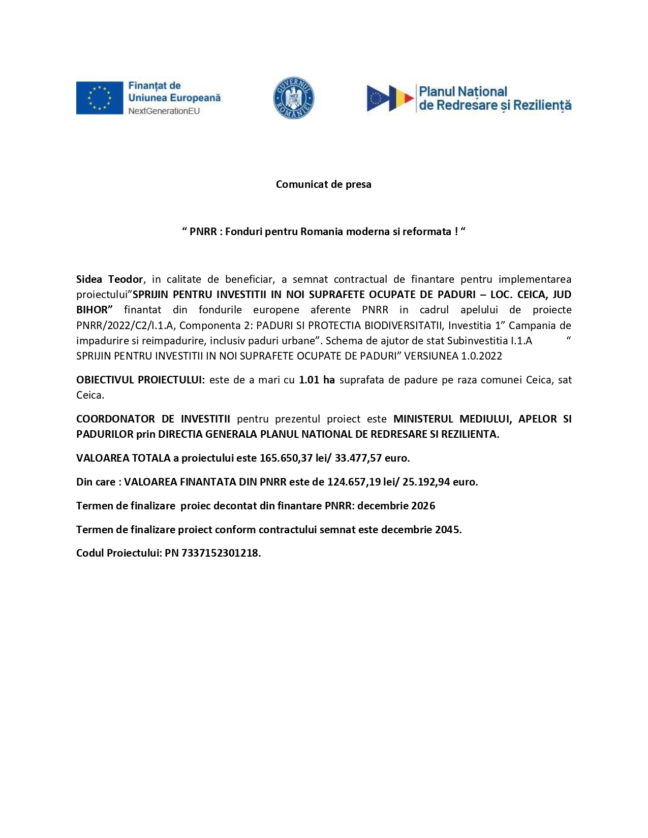 Sidea Teodor, in calitate de beneficiar, a semnat contractual de finantare pentru implementarea proiectului”SPRIJIN PENTRU INVESTITII IN NOI SUPRAFETE OCUPATE DE PADURI – LOC. CEICA, JUD BIHOR” finantat din fondurile europene aferente PNRR in cadrul apelului de proiecte PNRR/2022/C2/I.1.A, Componenta 2: PADURI SI PROTECTIA BIODIVERSITATII, Investitia 1” Campania de impadurire si reimpadurire, inclusiv paduri urbane”. Schema de ajutor de stat Subinvestitia I.1.A “ SPRIJIN PENTRU INVESTITII IN NOI SUPRAFETE OCUPATE DE PADURI” VERSIUNEA 1.0.2022