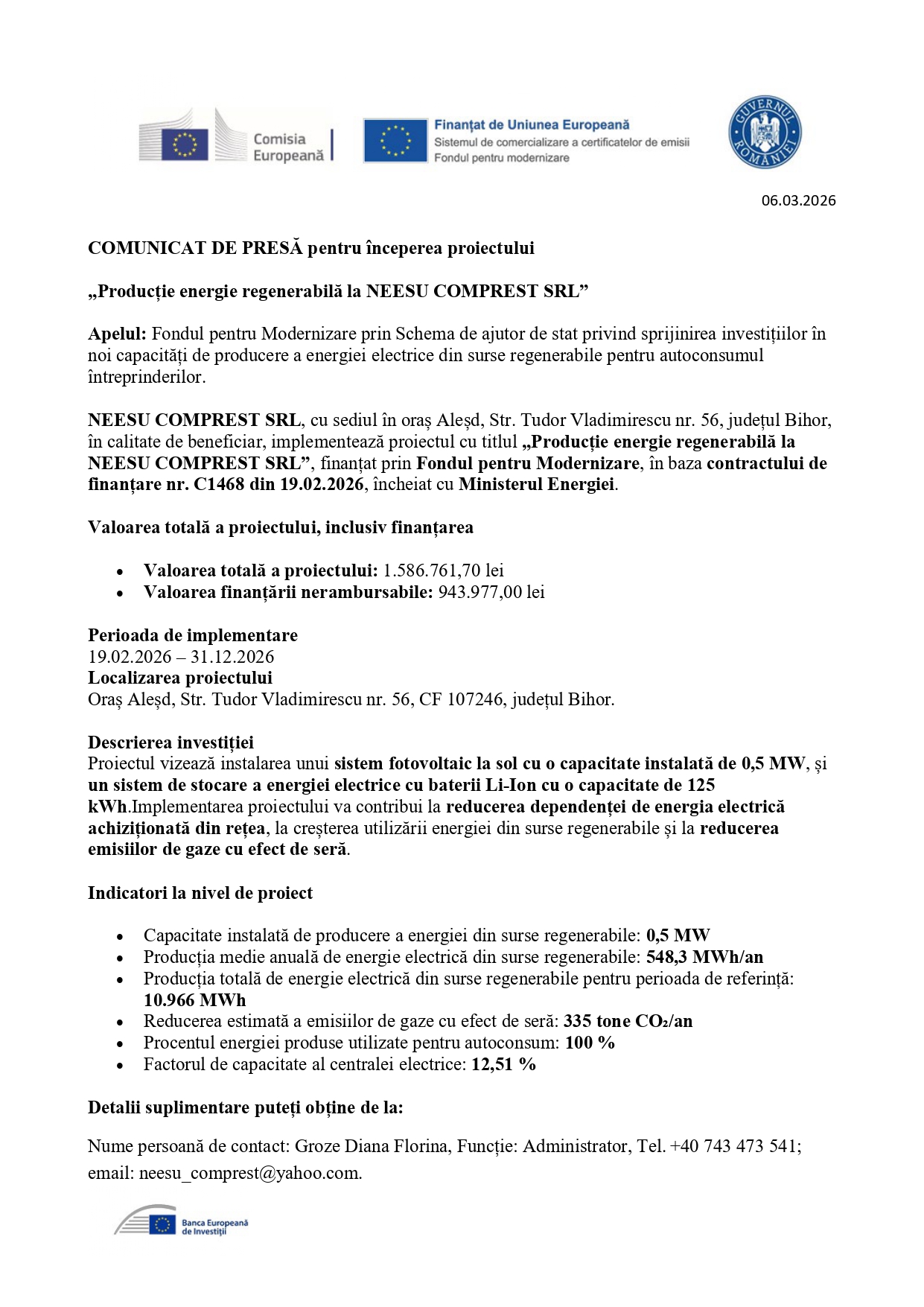 NEESU COMPREST SRL, cu sediul în oraș Aleșd, Str. Tudor Vladimirescu nr. 56, județul Bihor, în calitate de beneficiar, implementează proiectul cu titlul „Producție energie regenerabilă la NEESU COMPREST SRL”, finanțat prin Fondul pentru Modernizare, în baza contractului de finanțare nr. C1468 din 19.02.2026, încheiat cu Ministerul Energiei.