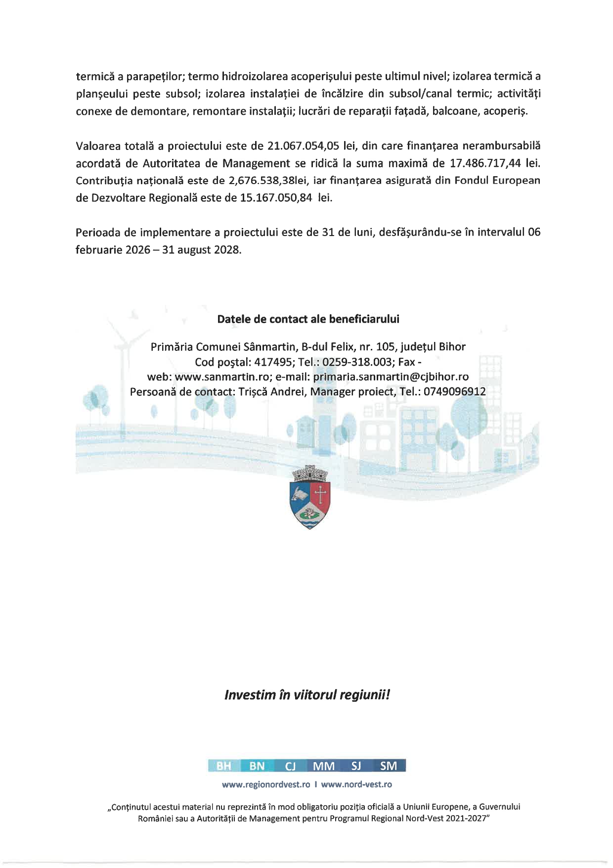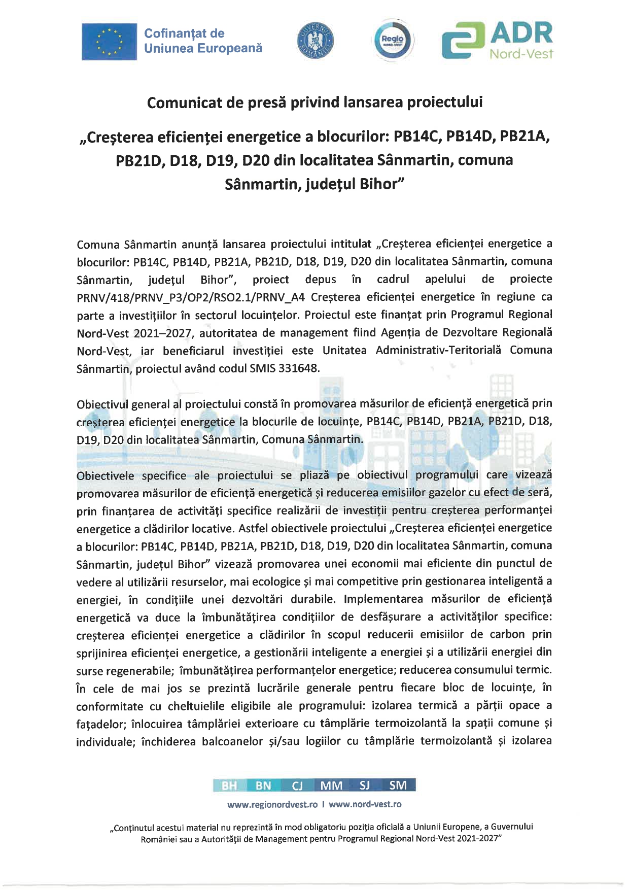 Comuna Sânmartin anunță lansarea proiectului intitulat „Creșterea eficienței energetice a blocurilor: PB14C, PB14D, PB21A, PB21D, D18, D19, D20 din localitatea Sânmartin, comuna Sânmartin, județul Bihor”, proiect depus în cadrul apelului de proiecte PRNV/418/PRNV_P3/OP2/RSO2.1/PRNV_A4 Creșterea eficienței energetice în regiune ca parte a investițiilor în sectorul locuințelor. Proiectul este finanțat prin Programul Regional Nord-Vest 2021–2027, autoritatea de management fiind Agenția de Dezvoltare Regională Nord-Vest, iar beneficiarul investiției este Unitatea Administrativ-Teritorială Comuna Sânmartin, proiectul având codul SMIS 331648.
