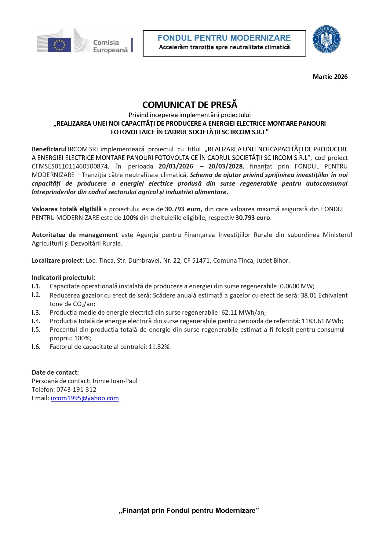 Beneficiarul IRCOM SRL implementează proiectul cu titlul „REALIZAREA UNEI NOI CAPACITĂȚI DE PRODUCERE A ENERGIEI ELECTRICE MONTARE PANOURI FOTOVOLTAICE ÎN CADRUL SOCIETĂȚII SC IRCOM S.R.L”, cod proiect CFMSES011011460500874, în perioada 20/03/2026 – 20/03/2028, finanțat prin FONDUL PENTRU MODERNIZARE – Tranziția către neutralitate climatică, Schema de ajutor privind sprijinirea investițiilor în noi capacități de producere a energiei electrice produsă din surse regenerabile pentru autoconsumul întreprinderilor din cadrul sectorului agricol și industriei alimentare.