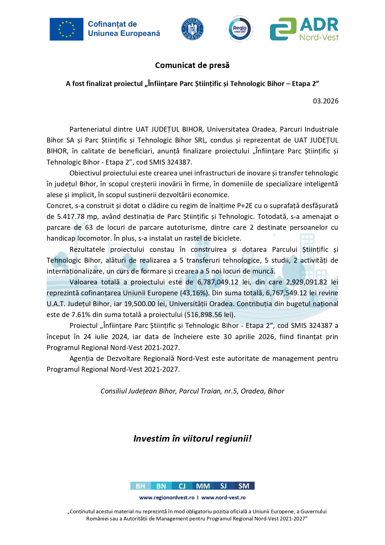 Parteneriatul dintre UAT JUDEȚUL BIHOR, Universitatea Oradea, Parcuri Industriale Bihor SA și Parc Științific și Tehnologic Bihor SRL, condus și reprezentat de UAT JUDEȚUL BIHOR, în calitate de beneficiari, anunță finalizarea proiectului „Înființare Parc Științific și Tehnologic Bihor – Etapa 2”, cod SMIS 324387.