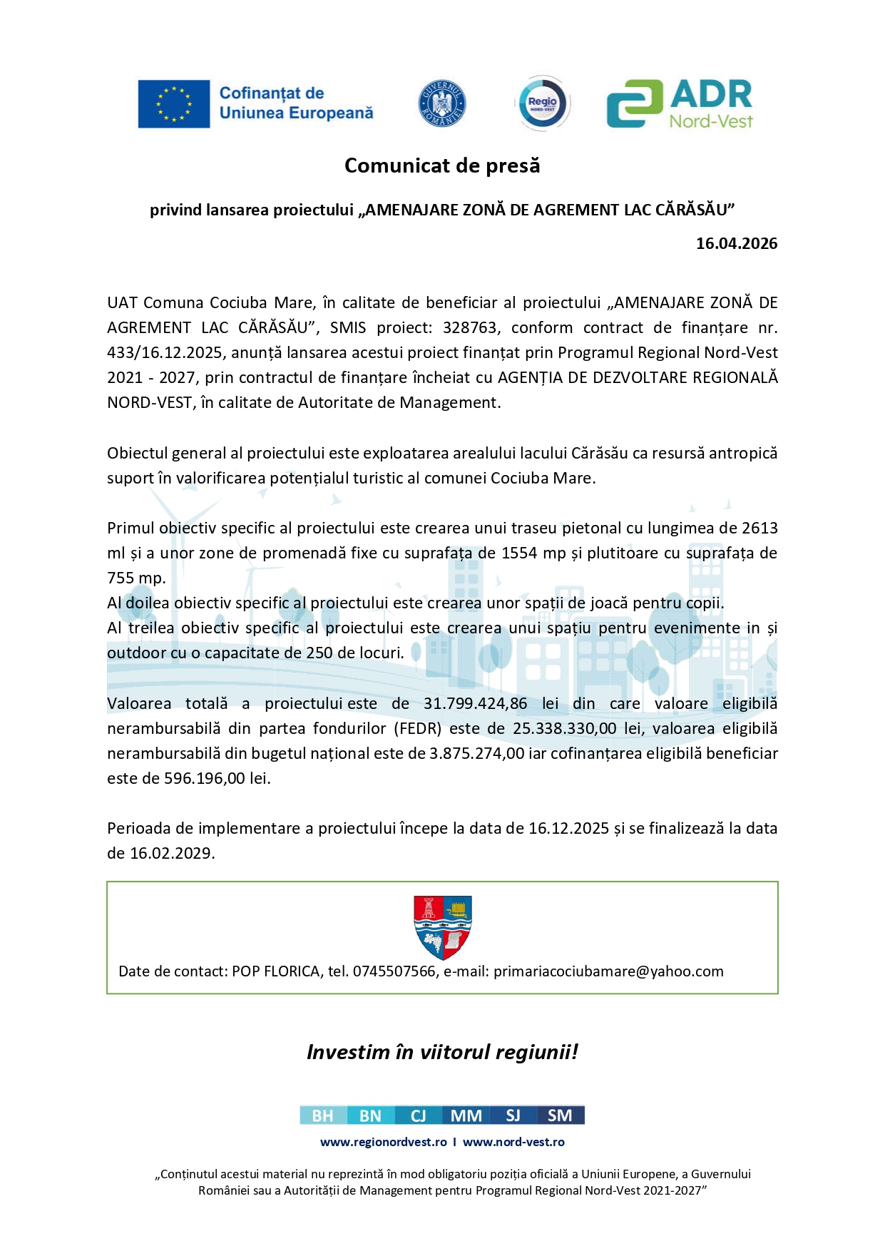 UAT Comuna Cociuba Mare, în calitate de beneficiar al proiectului „AMENAJARE ZONĂ DE AGREMENT LAC CĂRĂSĂU”, SMIS proiect: 328763, conform contract de finanțare nr. 433/16.12.2025, anunță lansarea acestui proiect finanțat prin Programul Regional Nord-Vest 2021 – 2027, prin contractul de finanțare încheiat cu AGENȚIA DE DEZVOLTARE REGIONALĂ NORD-VEST, în calitate de Autoritate de Management.