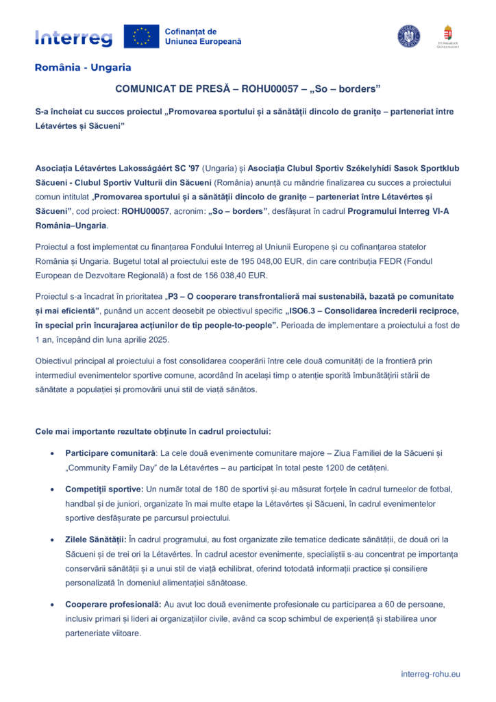 Asociația Létavértes Lakosságáért SC ’97 (Ungaria) și Asociația Clubul Sportiv Székelyhídi Sasok Sportklub Săcueni – Clubul Sportiv Vulturii din Săcueni (România) anunță cu mândrie finalizarea cu succes a proiectului comun intitulat „Promovarea sportului și a sănătății dincolo de granițe – parteneriat între Létavértes și Săcueni”, cod proiect: ROHU00057, acronim: „So – borders”, desfășurat în cadrul Programului Interreg VI-A România–Ungaria.
