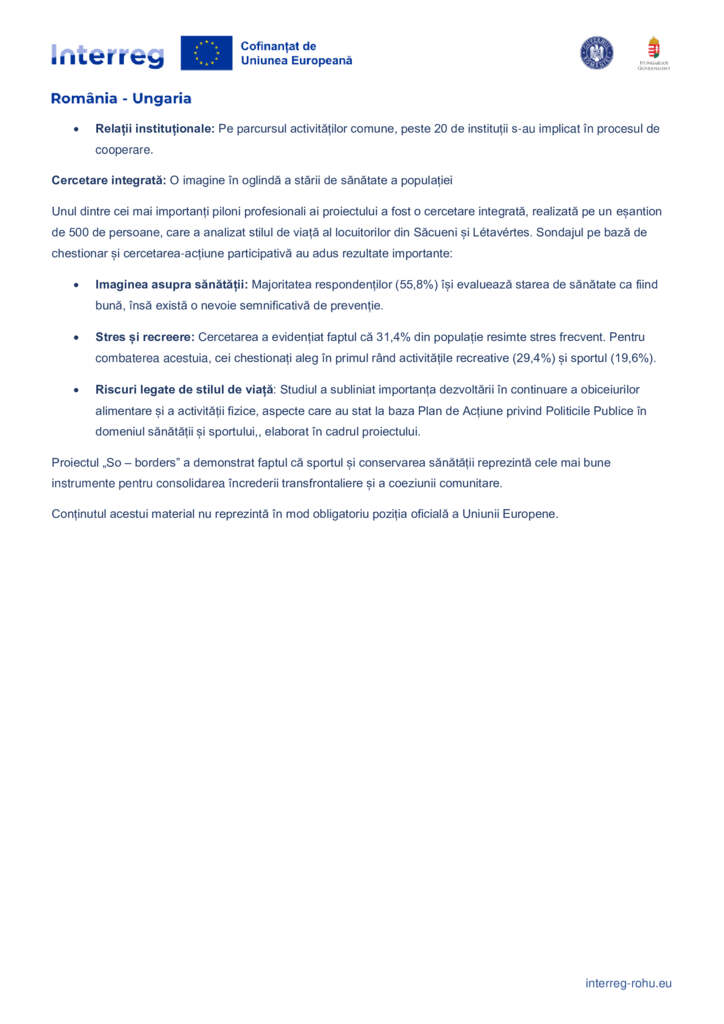 Proiectul „So – borders” a demonstrat faptul că sportul și conservarea sănătății reprezintă cele mai bune instrumente pentru consolidarea încrederii transfrontaliere și a coeziunii comunitare.