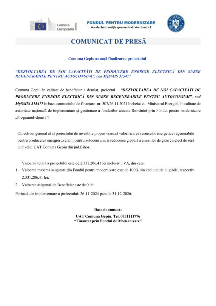 Comuna Gepiu în calitate de beneficiar a derulat, proiectul “DEZVOLTAREA DE NOI CAPACITĂȚI DE PRODUCERE ENERGIE ELECTRICĂ DIN SURSE REGENERABILE PENTRU AUTOCONSUM”, cod MySMIS 315477 în baza contractului de finanțare nr. 307/26.11.2024 încheiat cu Ministerul Energiei, în calitate de autoritate națională de implementare și gestionare a fondurilor alocate României prin Fondul pentru modernizare „Programul-cheie 1”.
