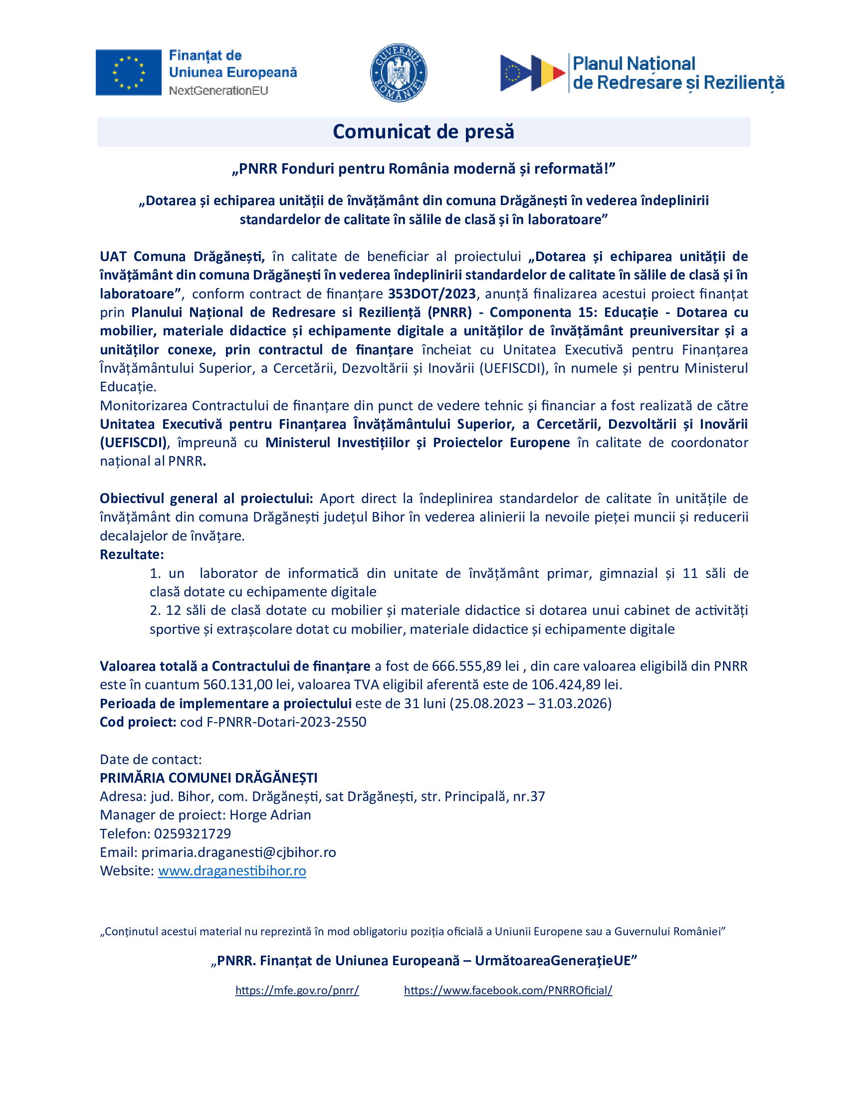 UAT Comuna Drăgănești, în calitate de beneficiar al proiectului „Dotarea și echiparea unității de învățământ din comuna Drăgănești în vederea îndeplinirii standardelor de calitate în sălile de clasă și în laboratoare”, conform contract de finanțare 353DOT/2023, anunță finalizarea acestui proiect finanțat prin Planului Național de Redresare si Reziliență (PNRR) – Componenta 15: Educație – Dotarea cu mobilier, materiale didactice și echipamente digitale a unităților de învățământ preuniversitar și a unităților conexe, prin contractul de finanțare încheiat cu Unitatea Executivă pentru Finanțarea Învățământului Superior, a Cercetării, Dezvoltării și Inovării (UEFISCDI), în numele și pentru Ministerul Educație.