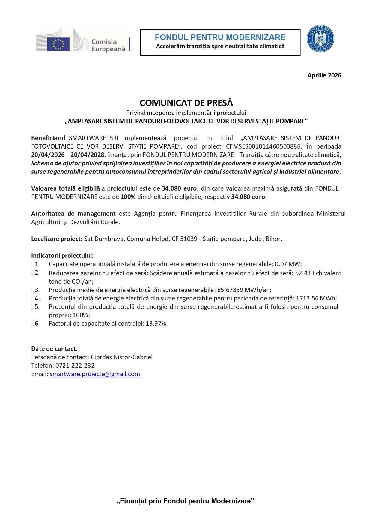 Beneficiarul SMARTWARE SRL implementează proiectul cu titlul „AMPLASARE SISTEM DE PANOURI FOTOVOLTAICE CE VOR DESERVI STAȚIE POMPARE”, cod proiect CFMSES001011460500886, în perioada 20/04/2026 – 20/04/2028, finanțat prin FONDUL PENTRU MODERNIZARE – Tranziția către neutralitate climatică, Schema de ajutor privind sprijinirea investițiilor în noi capacități de producere a energiei electrice produsă din surse regenerabile pentru autoconsumul întreprinderilor din cadrul sectorului agricol și industriei alimentare.