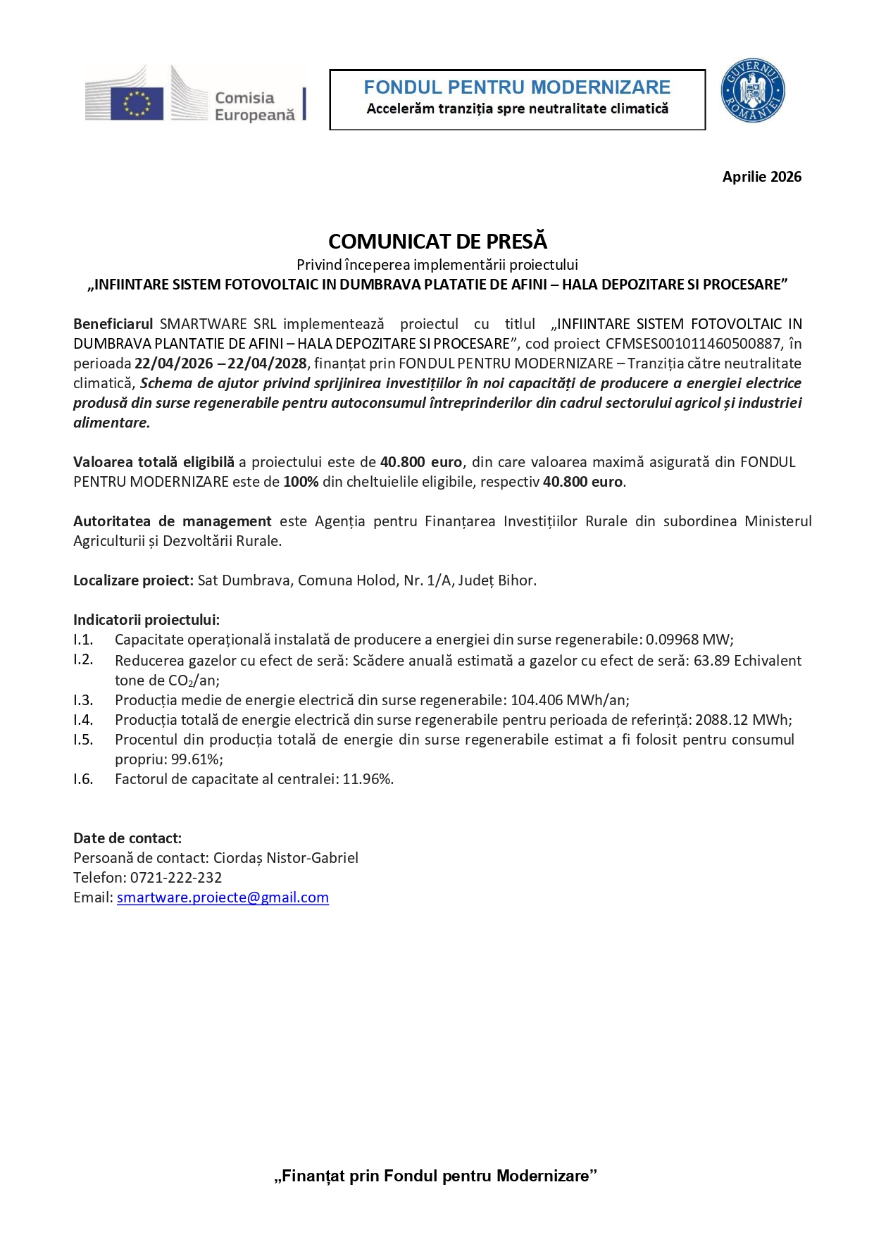 Beneficiarul SMARTWARE SRL implementează proiectul cu titlul „INFIINTARE SISTEM FOTOVOLTAIC IN DUMBRAVA PLANTATIE DE AFINI – HALA DEPOZITARE SI PROCESARE”, cod proiect CFMSES001011460500887, în perioada 22/04/2026 – 22/04/2028, finanțat prin FONDUL PENTRU MODERNIZARE – Tranziția către neutralitate climatică, Schema de ajutor privind sprijinirea investițiilor în noi capacități de producere a energiei electrice produsă din surse regenerabile pentru autoconsumul întreprinderilor din cadrul sectorului agricol și industriei alimentare.