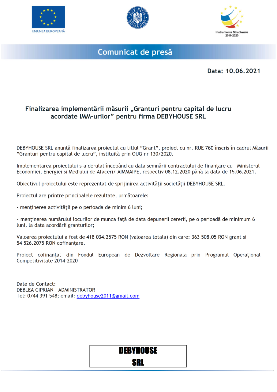 DEBYHOUSE SRL anunță finalizarea proiectul cu titlul ”Grant”, proiect cu nr. RUE 760 înscris în cadrul Măsurii ”Granturi pentru capital de lucru”, instituită prin OUG nr 130/2020.