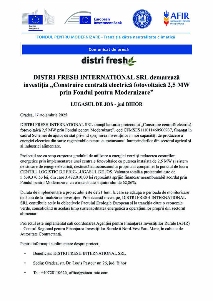 DISTRI FRESH INTERNATIONAL SRL anuntä lansarea proiectului „Construire centralä electricä fotovoltaicä 2,5 MW prin Fondul pentru Modernizare”, cod CFMSES 1 11011460500937, finantat în cadrul Schemei de ajutor de stat privind sprijinirea investitiilor în noi capacitäti de producere a energiei electrice din surse regenerabile pentru autoconsumul întreprinderilor din sectorul agricol