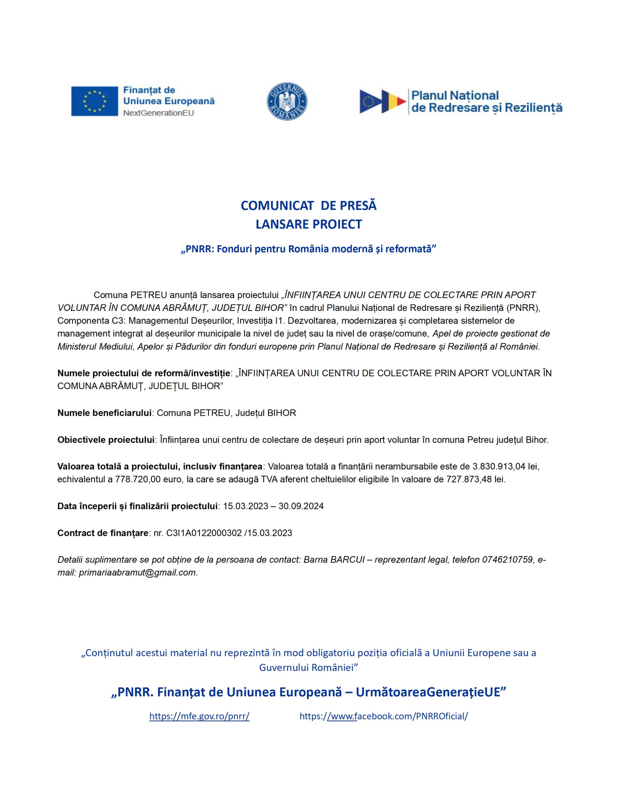 Comuna PETREU anunță lansarea proiectului „ÎNFIINȚAREA UNUI CENTRU DE COLECTARE PRIN APORT VOLUNTAR ÎN COMUNA ABRĂMUȚ, JUDEȚUL BIHOR” în cadrul Planului Național de Redresare și Reziliență (PNRR), Componenta C3: Managementul Deșeurilor, Investiția I1. Dezvoltarea, modernizarea și completarea sistemelor de management integrat al deșeurilor municipale la nivel de județ sau la nivel de orașe/comune, Apel de proiecte gestionat de Ministerul Mediului, Apelor și Pădurilor din fonduri europene prin Planul Național de Redresare și Reziliență al României.