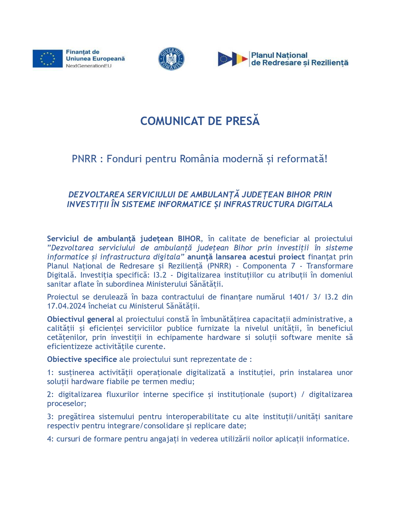 Proiectul se derulează în baza contractului de finanțare numărul 1401/ 3/ I3.2 din 17.04.2024 încheiat cu Ministerul Sănătății.