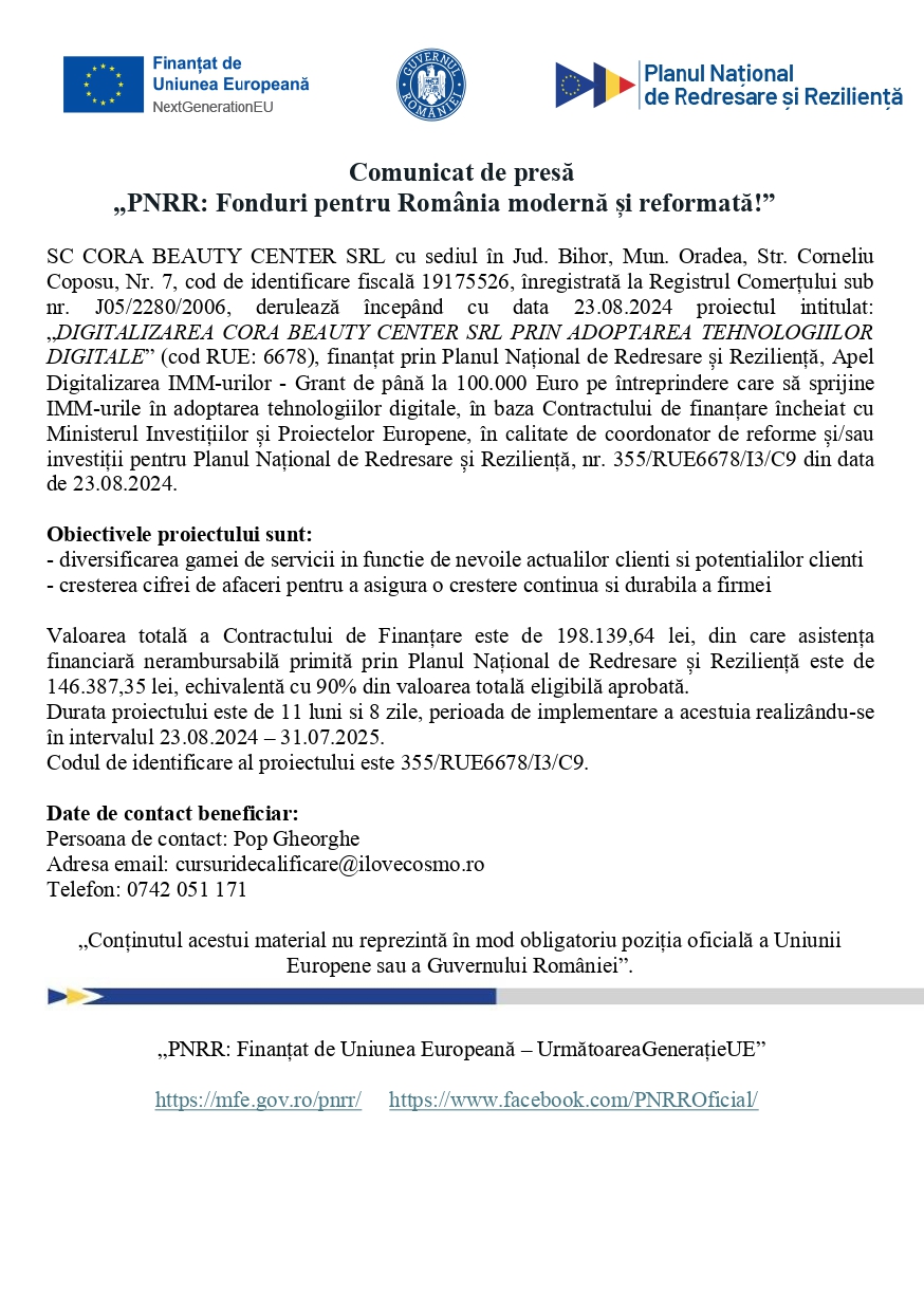 SC CORA BEAUTY CENTER SRL cu sediul în Jud. Bihor, Mun. Oradea, Str. Corneliu Coposu, Nr. 7, cod de identificare fiscală 19175526, înregistrată la Registrul Comerțului sub nr. J05/2280/2006, derulează începând cu data 23.08.2024 proiectul intitulat: „DIGITALIZAREA CORA BEAUTY CENTER SRL PRIN ADOPTAREA TEHNOLOGIILOR DIGITALE” (cod RUE: 6678), finanțat prin Planul Național de Redresare și Reziliență, Apel Digitalizarea IMM-urilor – Grant de până la 100.000 Euro pe întreprindere care să sprijine IMM-urile în adoptarea tehnologiilor digitale, în baza Contractului de finanțare încheiat cu Ministerul Investițiilor și Proiectelor Europene, în calitate de coordonator de reforme și/sau investiții pentru Planul Național de Redresare și Reziliență, nr. 355/RUE6678/I3/C9 din data de 23.08.2024.