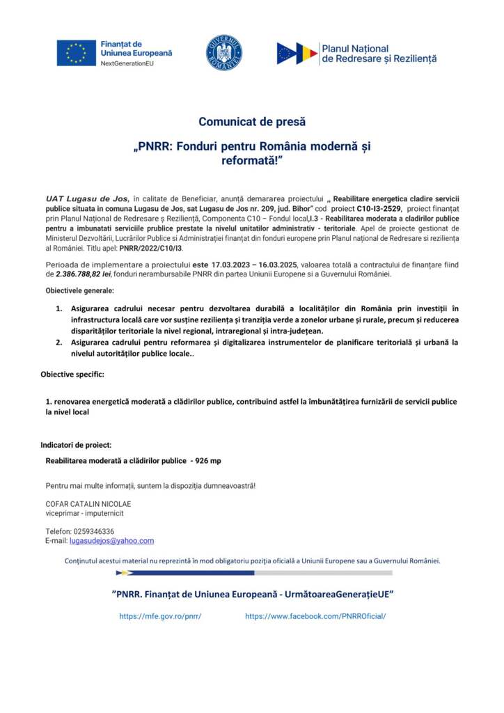 UAT Lugasu de Jos, în calitate de Beneficiar, anunță demararea proiectului ,, Reabilitare energetica cladire servicii publice situata in comuna Lugasu de Jos, sat Lugasu de Jos nr. 209, jud. Bihor” cod proiect C10-I3-2529, proiect finanțat prin Planul Național de Redresare ș Reziliență, Componenta C10 – Fondul local,I.3 – Reabilitarea moderata a cladirilor publice pentru a imbunatati serviciile prublice prestate la nivelul unitatilor administrativ – teritoriale. Apel de proiecte gestionat de Ministerul Dezvoltării, Lucrărilor Publice si Administrației finanțat din fonduri europene prin Planul național de Redresare si reziliența al României. Titlu apel: PNRR/2022/C10/I3.