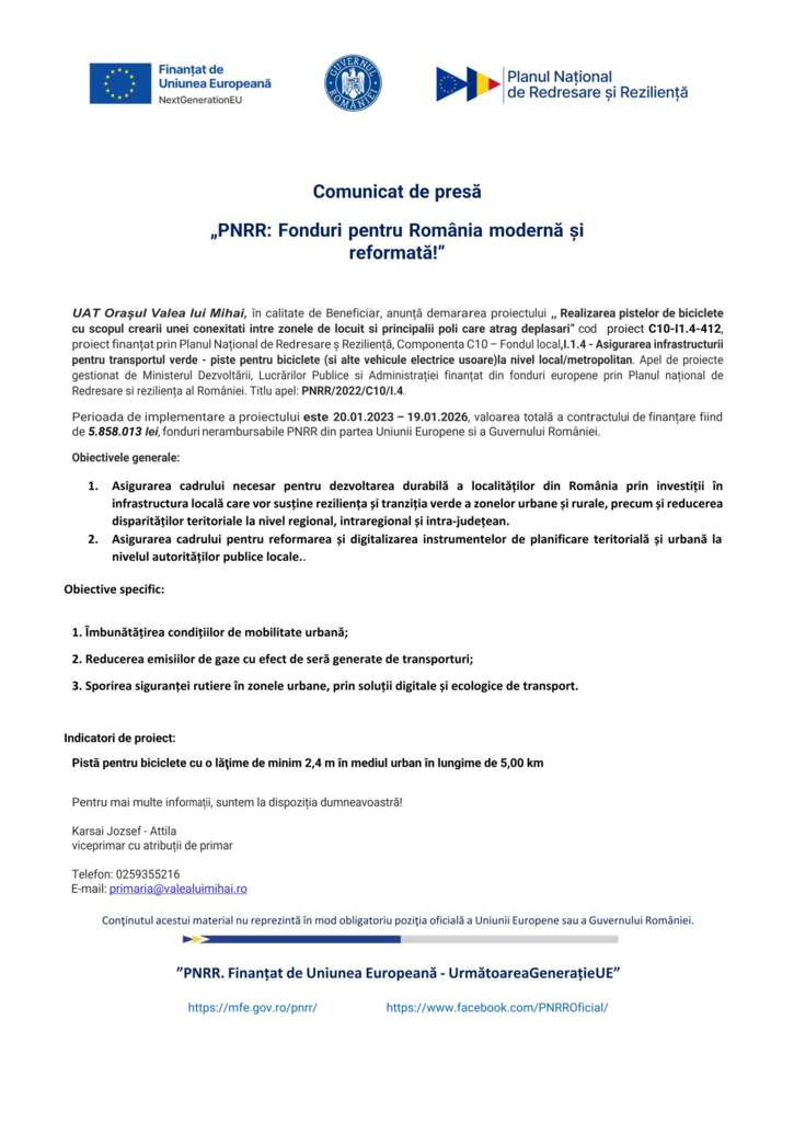 UAT Orașul Valea lui Mihai, în calitate de Beneficiar, anunță demararea proiectului ,, Realizarea pistelor de biciclete cu scopul crearii unei conexitati intre zonele de locuit si principalii poli care atrag deplasari” cod proiect C10-I1.4-412, proiect finanțat prin Planul Național de Redresare ș Reziliență, Componenta C10 – Fondul local,I.1.4 – Asigurarea infrastructurii pentru transportul verde – piste pentru biciclete (si alte vehicule electrice usoare)la nivel local/metropolitan. Apel de proiecte gestionat de Ministerul Dezvoltării, Lucrărilor Publice si Administrației finanțat din fonduri europene prin Planul național de Redresare si reziliența al României. Titlu apel: PNRR/2022/C10/I.4.