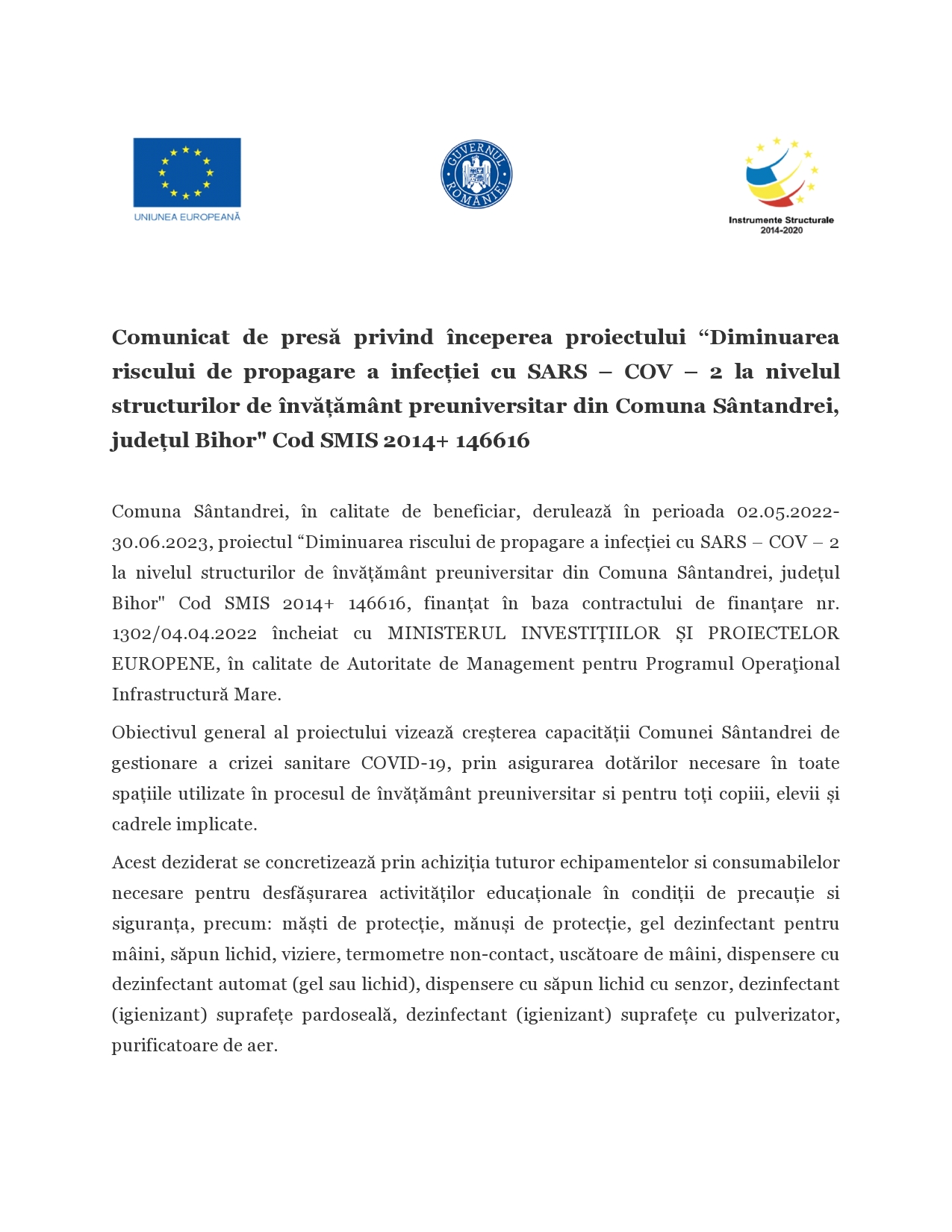 Comuna Sântandrei, în calitate de beneficiar, derulează în perioada 02.05.2022-30.06.2023, proiectul “Diminuarea riscului de propagare a infecției cu SARS – COV –2 la nivelul structurilor de învățământ preuniversitar din Comuna Sântandrei, județul Bihor” Cod SMIS 2014+ 146616, finanțat în baza contractului de finanțare nr.1302/04.04.2022 încheiat cu MINISTERUL INVESTIȚIILOR ȘI PROIECTELOR EUROPENE, în calitate de Autoritate de Management pentru Programul Operaţional Infrastructură Mare.