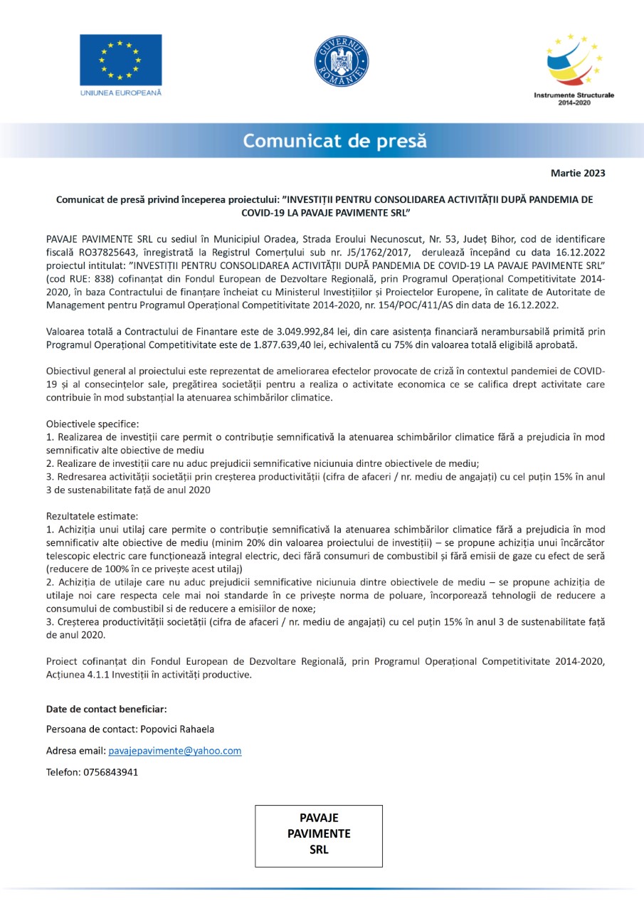 PAVAJE PAVIMENTE SRL cu sediul în Municipiul Oradea, Strada Eroului Necunoscut, Nr. 53, Județ Bihor, cod de identificare fiscală RO37825643, înregistrată la Registrul Comerțului sub nr. J5/1762/2017, derulează începând cu data 16.12.2022 proiectul intitulat: ”INVESTIȚII PENTRU CONSOLIDAREA ACTIVITĂȚII DUPĂ PANDEMIA DE COVID-19 LA PAVAJE PAVIMENTE SRL” (cod RUE: 838) cofinanțat din Fondul European de Dezvoltare Regională, prin Programul Operațional Competitivitate 2014-2020, în baza Contractului de finanțare încheiat cu Ministerul Investițiilor și Proiectelor Europene, în calitate de Autoritate de Management pentru Programul Operațional Competitivitate 2014-2020, nr. 154/POC/411/AS din data de 16.12.2022.