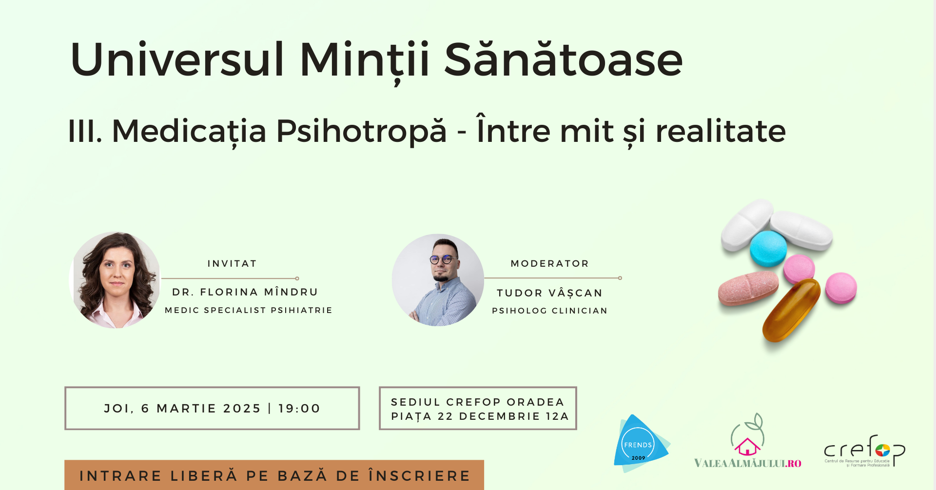 Următoarea conferință „Medicația Psihotropă – Între mit și realitate” va avea loc la 6 martie, de la ora 19:00, la sediul CREFOP Oradea (Piața 22 Decembrie, nr. 12A), cu acces gratuit în limita locurilor disponibile. Invitatul special, dr. Florina Mîndru, medic specialist psihiatrie, va explora miturile legate de medicația psihotropă și va oferi clarificări despre semnele care indică necesitatea consultării unui specialist.