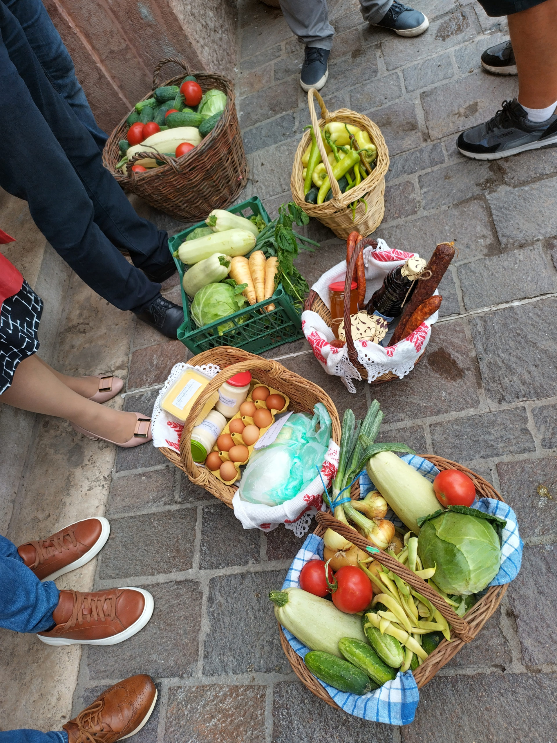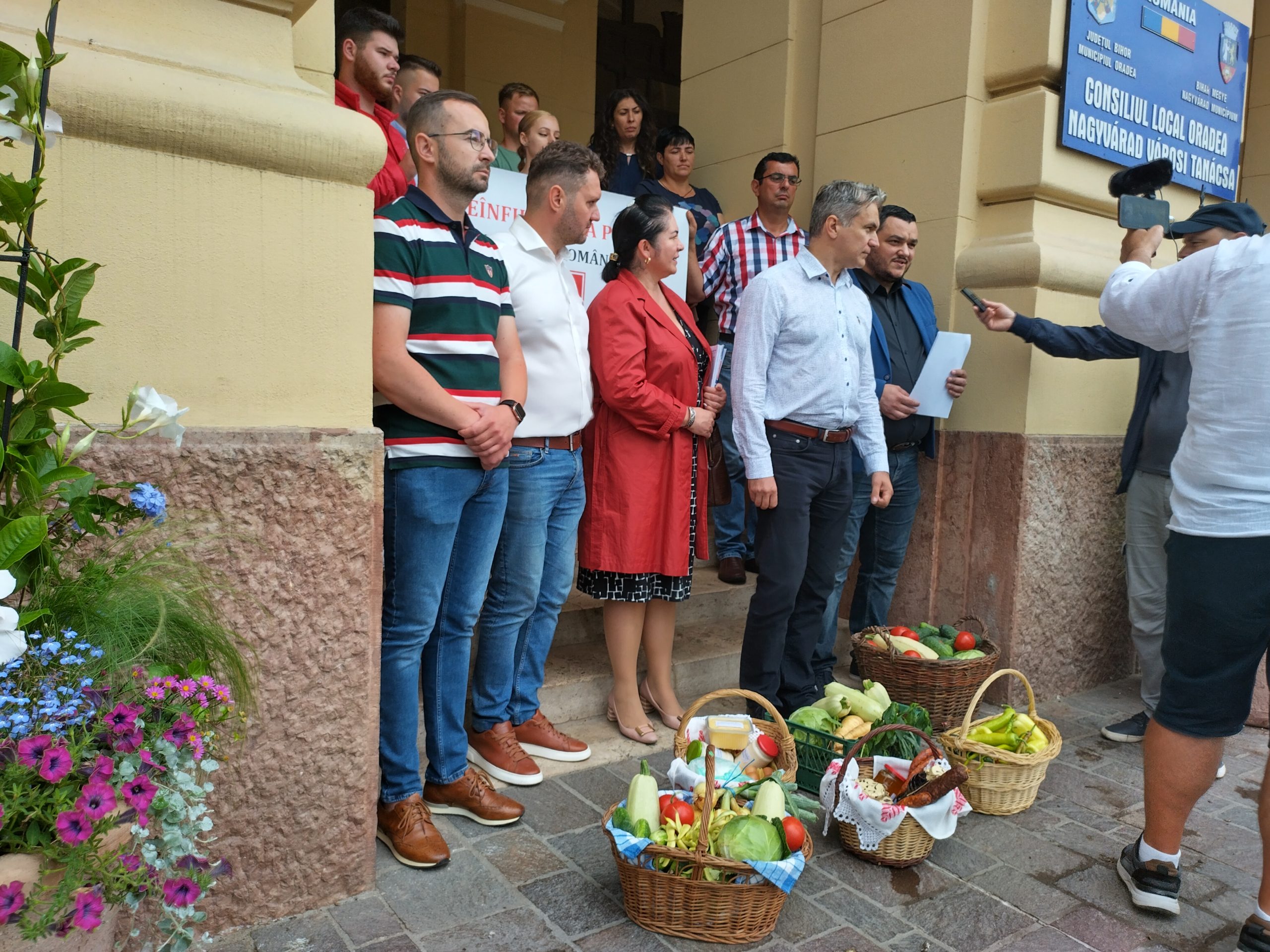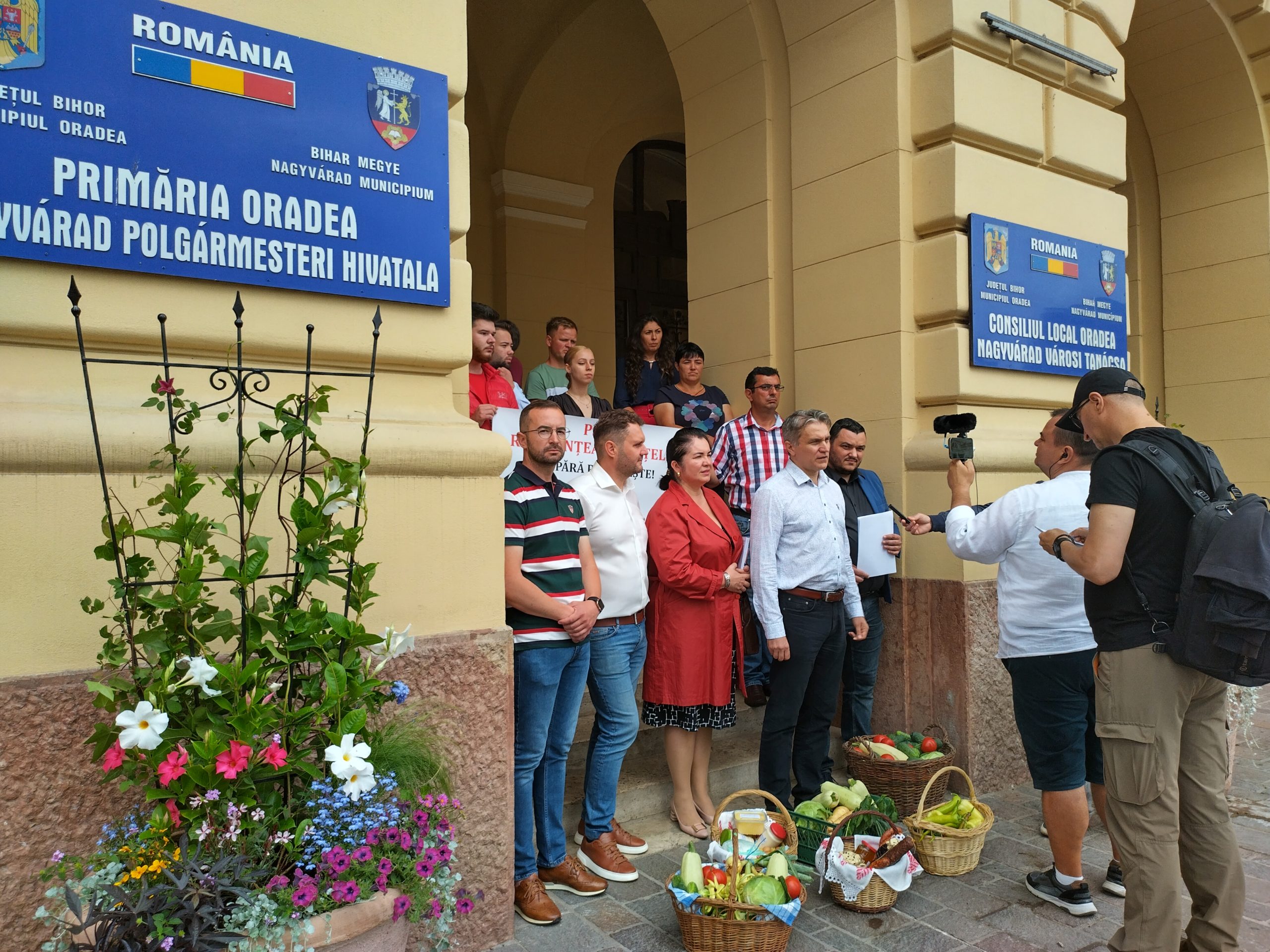 Ca urmare, joi dimineața, Adrian Madar, Liviu Sabău Popa, Bungău Florica, alături de Florian Sîrca și mai mulți membri de partid și producători locali, s-au întâlnit pe treptele Primăriei Oradea, să își prezinte, din nou inițiativa. Pentru un plus de savoare locală, au adus și recuzită: coșuri pline de legume, fructe, brânzeturi, mezeluri și alte produse din Bihor.