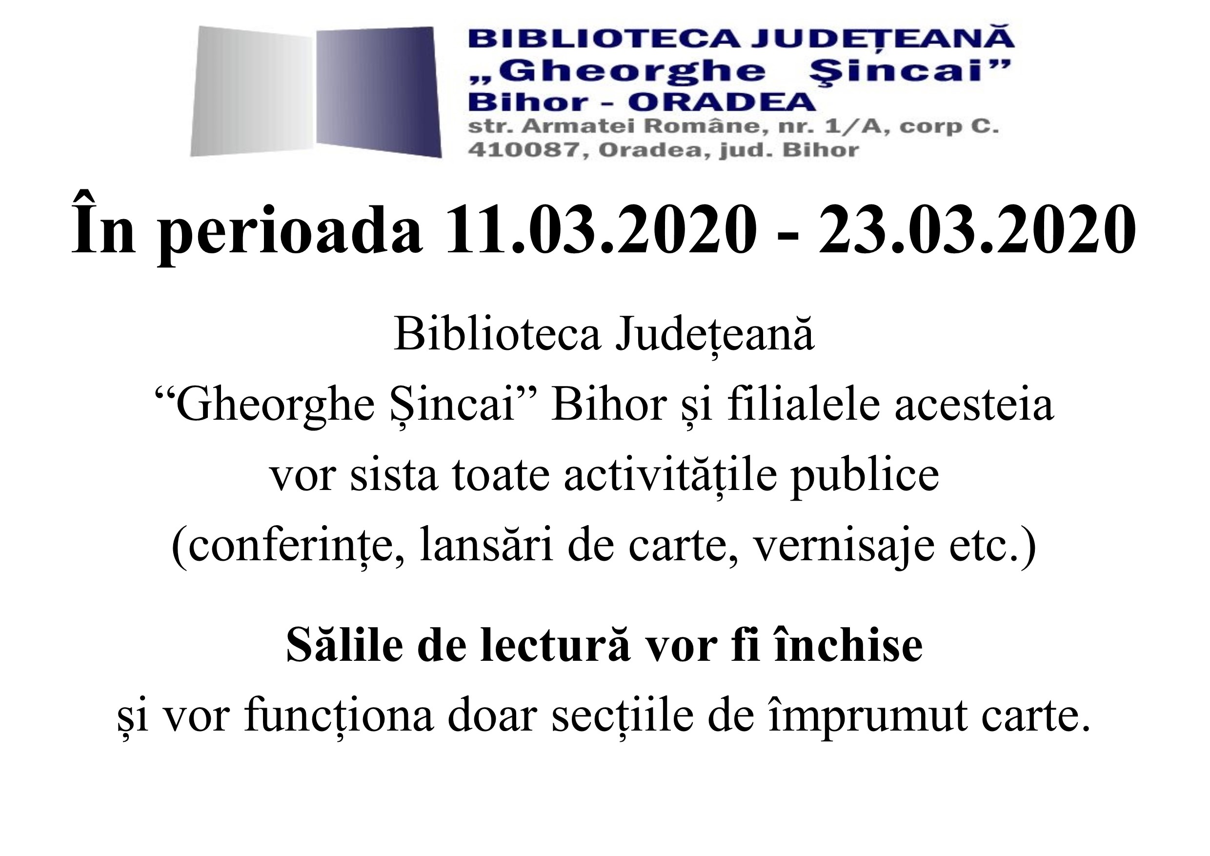 „În perioada 11-23 martie 2020, se suspendă toate activitățile publice, iar sălile de lectură vor fi închise. Vor fi deschise doar secțiile de împrumut carte, de luni până vineri, între orele 8:00-19:00″, transmit reprezentanții Bibliotecii Județene „Gheorghe Șincai”.