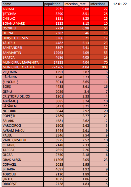 13 localități bihorene înregistrează o incidență mai mare de 4 cazuri la 1.000 de locuitori. Cea mai mare incidență este la Abram – 9,08 cazuri la 1.000 de locuitori.