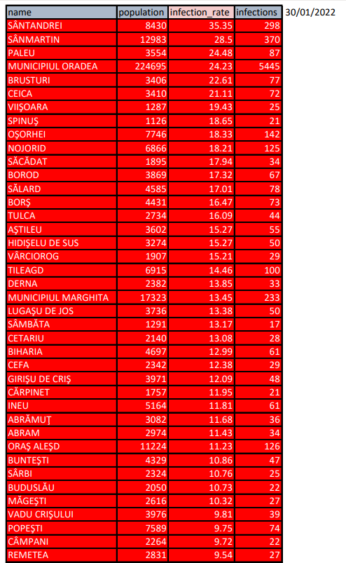 Cu toate acestea, incidența din Oradea și localitățile învecinate a crescut din nou. Sântandrei are o incidență a cazurilor de 35,35 la mia de locuitori, în timp ce Sânmartin – 28,5‰, Paleu – 24,48‰ și Oradea 24,23‰.