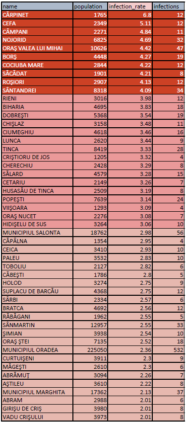 În tabelul de mai jos sunt prezentate localitățile din Bihor în care se înregistrează în prezent o incidență mai mare de 2 cazuri / 1.000 locuitori.