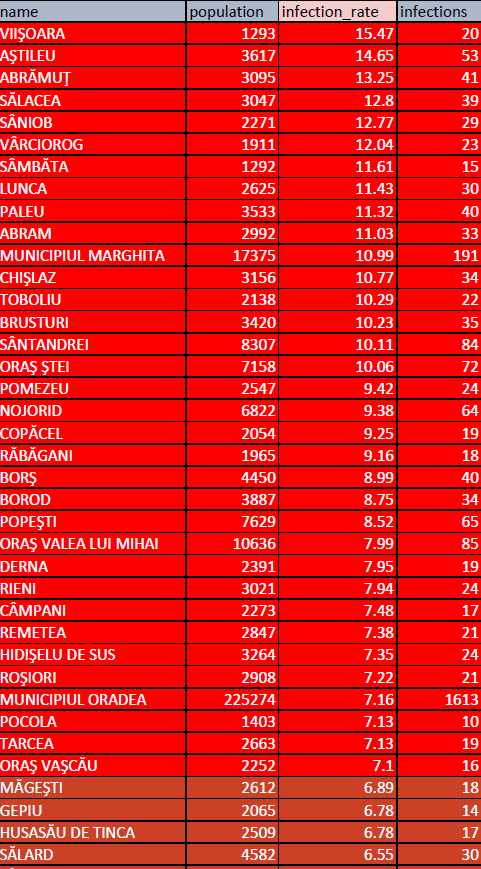 Cea mai ridicată incidență din județ o înregistrează localitatea Viișoara, care de altfel a scăzut și ea după ce două persoane din comună au fost vindecate de COVID, ajungând la 15.47‰, de la 17.01‰.