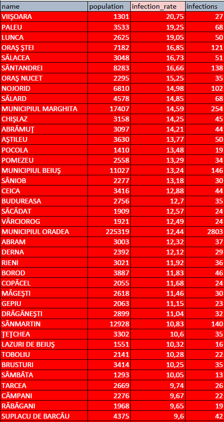 Topul negativ al ratei de infectare din județul Bihor pare neschimbat față de ziua precedentă, însă incidențele au crescut. Astfel, localitatea Viișoara a depășit incidența de 20‰, Paleu a ajuns la 19.25‰ iar pe poziția a treia se situează comuna Lunca, cu incidența de 19.05‰.