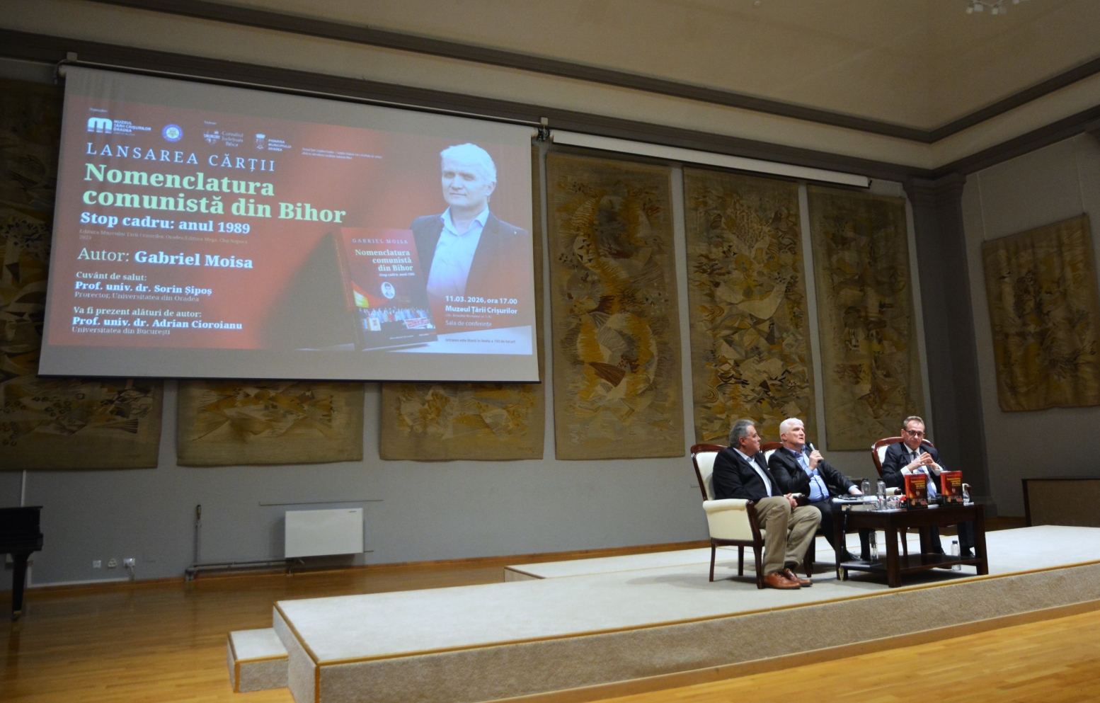 La lansarea celei mai recente cărţi a managerului Muzeului Țării Crișurilor – Complex Muzeal, istoricul Gabriel Moisa, sala de conferinţe a instituţiei a fost arhiplină. Volumul „Nomenclatura comunistă din Bihor – Stop cadru: anul 1989”, apărut anul trecut la Editura Muzeului Țării Crișurilor, a atras în sală atât tânăra generaţie cât şi pe cei care au cunoscut traiul în regimul comunist, inclusiv membri ai nomenclaturii din acele vremuri.