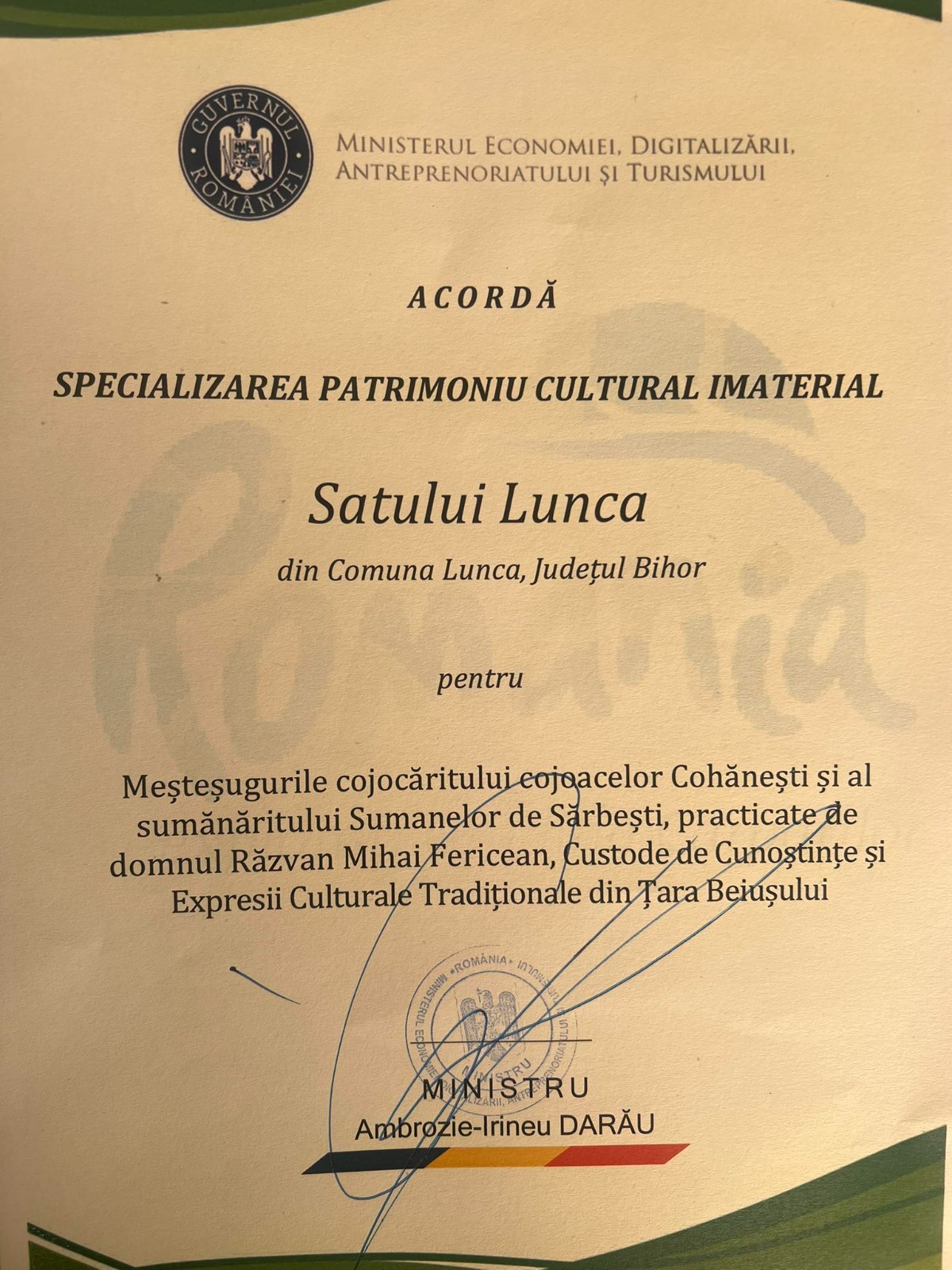 Satul bihorean Lunca a primit din partea Ministerului Economiei, Digitalizării, Antreprenoriatului şi Turismului „Specializarea patrimoniu cultural imaterial” pentru „meşteşugurile cojocăritului cojoacelor Cohăneşti şi al sumănăritului sumanelor de sărbeşti practicate de domnul Răzvan Mihai Fericean, Custode de Cunostinţe şi Expresii Culturale Tradiţionale din Ţara Beiuşului”.