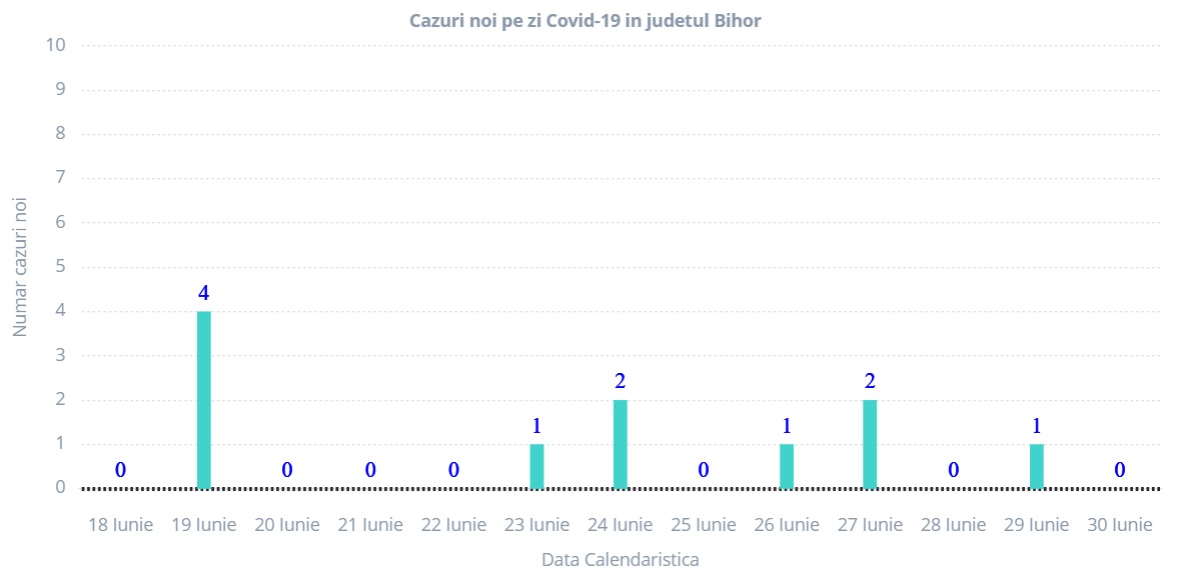 Conform graficului următor, în ultimele 30 de zile, aferente lunii iunie a existat doar o zi în care numărul infectărilor a depășit 10 cazuri raportate pe zi, în Bihor (2 iunie). Următoarea zi, cu un număr peste medie de infectări coronavirus a fost în data de 6 iunie, când au fost pozitivați coronavirus 8 bihoreni. În zilele de 4 și 14 iunie au fost confirmate câte cinci cazuri, iar pe 29 iunie au fost confirmate 4 infectări coronavirus, în județul Bihor. În zilele de 3,5 și 7 iunie au fost confirmate câte 3 cazuri de îmbolnăvire COVID-19, iar în 11,12,13,24 și 27 iunie au fost confirmate câte două cazuri de coronavirus. Totodată, în luna iunie au existat 10 zile, în care numărul de cazuri noi raportat în Bihor a fost zero! În cinci zile din luna iunie, GCS a raportat câte un singur caz de infectare coronavirus, în Bihor.