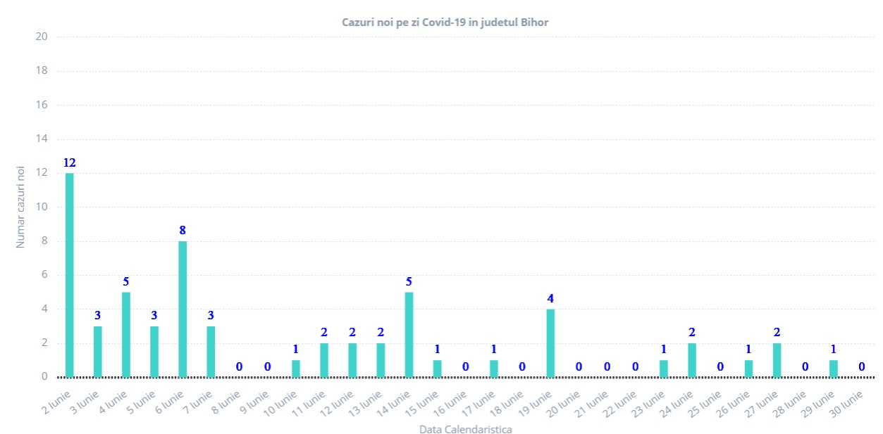 În ultimele 30 de zile, din data de 2 iunie, când au fost confirmate într-o singură zi, 12 infectări coronavirus în județul Bihor, numărul cazurilor noi de coronavirus, raportat de la o zi la alta, a început să scadă.