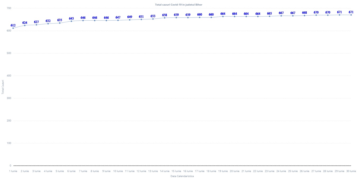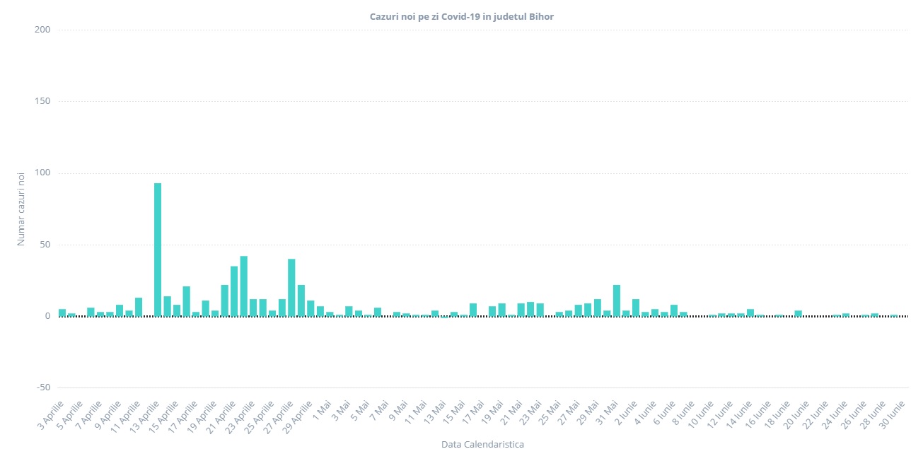 De pe data de 2 aprilie și până pe 30 iunie, în județul Bihor au fost confirmate în total 671 de cazuri coronavirus. Vârful numărului de cazuri noi din Bihor, raportat de autorități a fost atins în perioada 13-15 aprilie, când au fost confirmate aproape 100 de cazuri, în județul Bihor.