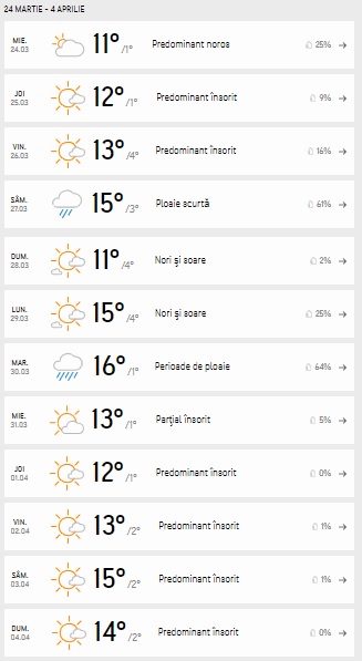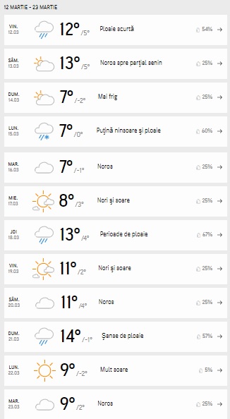 UPDATE! Potrivit Accuweather.com, valorile termice din următoarea perioadă se situează în jurul unei medii de 12-13 grade, excepție făcând ziua de sâmbătă, 06 martie când termometrele vor indica doar 6 grade. Sunt așteptate și averse dar în general va fi soare iar pe finalul lunii, media va fi de 14 grade.