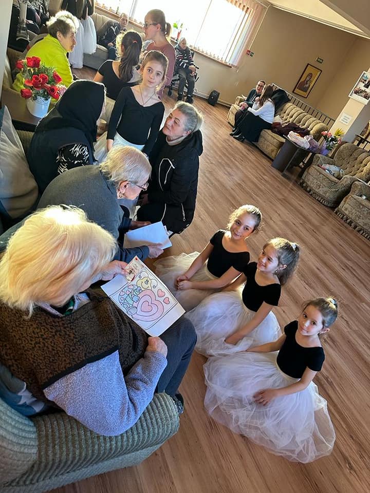 La finalul programului cele 8 balerine – Giulia, Anastasia, Maria, Anna, Iza, Bianca, Ilinca și Mara, au împărțit vârstnicilor desene – felicitări desenate sau pictate de elevii scolii de balet, atât adulți cat și copii, însoțite de câte un mărțișor care vestește primăvară. Au adus, în dar, și fructe pentru toți chiriașii.