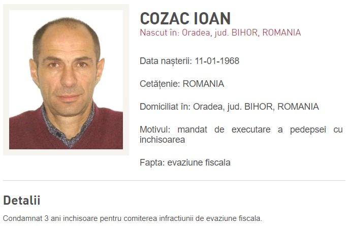 Ioan Cozac figurează pe lista infractorilor urmăriți național, după ce, în noiembrie 2019, a fost condamnat de Curtea de Apel Timișoara, la 3 ani de închisoare cu executare pentru evaziune. Atunci a fost acuzat că a emis, în numele unei societăți comerciale, trei facturi de un milion de lei, în baza unui contract de prestări-servicii încheiat cu o altă firmă.