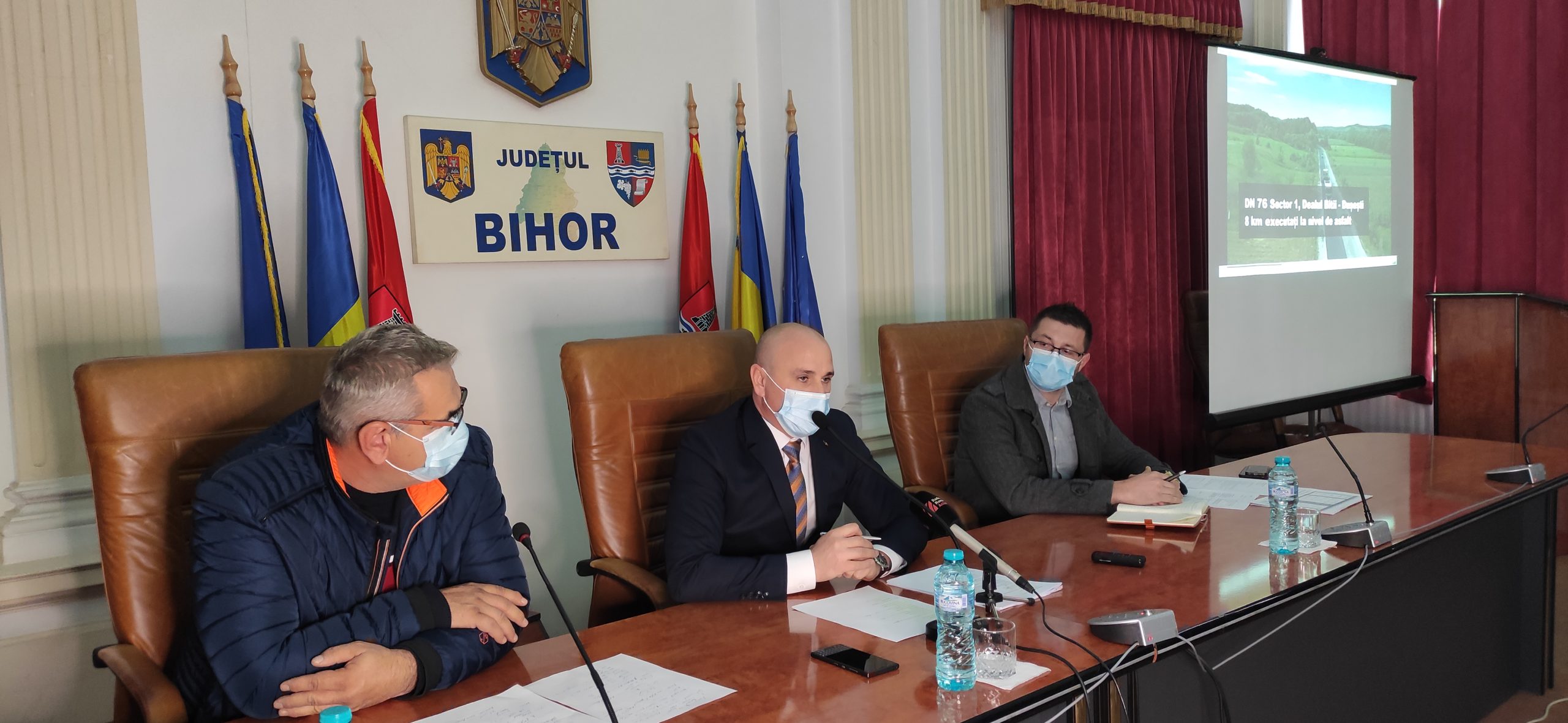Prefectul Țiplea, încadrat de directorul regional al Drumurilor Naționale și Podurilor, Eugen Cecan (stânga) și directorul Secției Drumuri Naționale Oradea, Traian Bulzan, în timpul conferinței de presă susținută la Prefectură