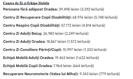 În acest peisaj, serviciile de zi și echipele mobile reprezintă soluțiile cele mai eficiente din punct de vedere al costurilor, deoarece nu implică găzduire permanentă. Astfel, echipa mobilă pentru adulți din Oradea cheltuiește lunar doar 1.622 lei per beneficiar, în timp ce centrul de recuperare din Valea lui Mihai înregistrează un cost minim de 779 lei.