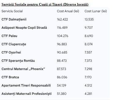 În vârful piramidei cheltuielilor pentru adulți se situează Centrul de Îngrijire și Asistență Încrederea, unde sprijinul pentru un singur beneficiar presupune un efort anual de 140.343 lei, ceea ce înseamnă o alocare lunară de aproximativ 11.700 lei.