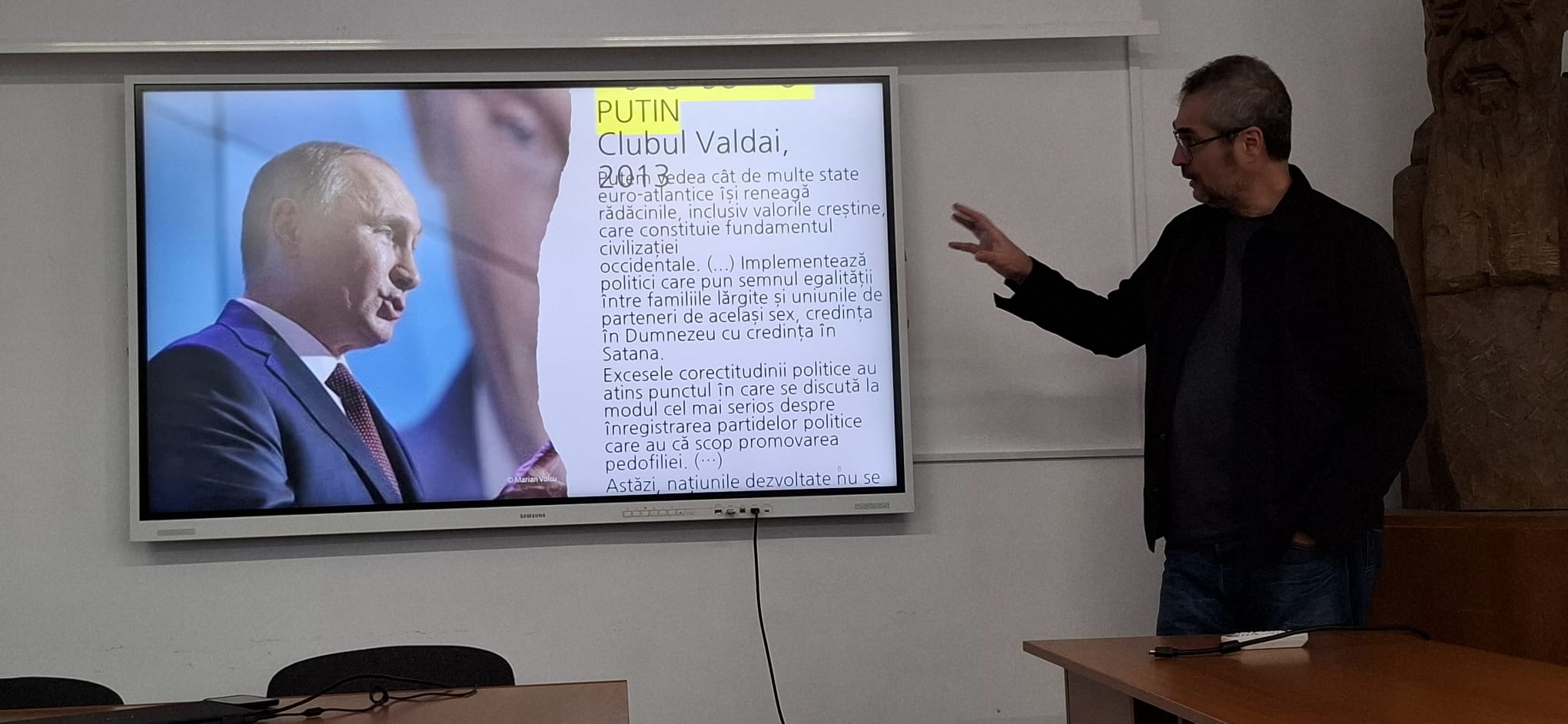 Vineri, 14 noiembrie, de la ora 13:00, la sediul Facultății IRISPSC, sala Nicolae Iorga, a avut loc prezentarea cu o varietate de teme incisive și utile pentru viitorii jurnaliști, pe problema conceptualizării democrației, dezinformării și teoriilor conspirației. Interesați și captivați, studenții s-au implicat în dialogul cu invitații, atât dintr-o curiozitate academică, cât și dintr-o preocupare reală pentru realitățile sociale și politice actuale.