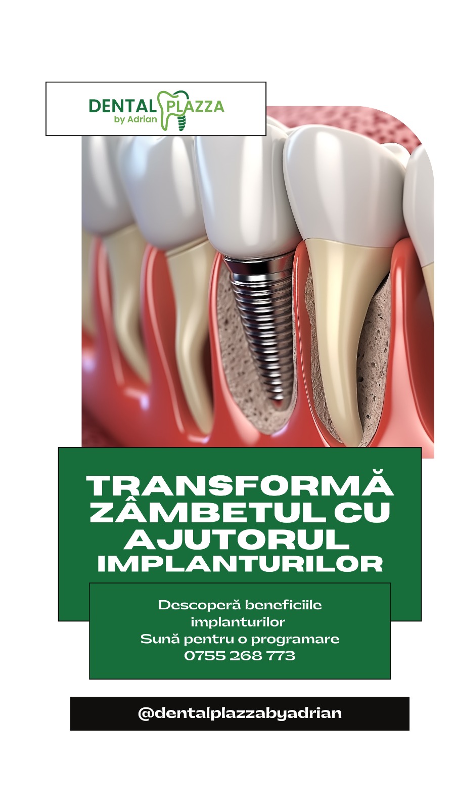 La Dental Plazza by Adrian, zâmbetul vostru este prioritatea noastră! Dacă te confrunți cu lipsa unui dinte sau ai nevoie de un implant dentar, suntem aici să îți oferim soluții personalizate și durabile, într-un mediu cald și primitor.
