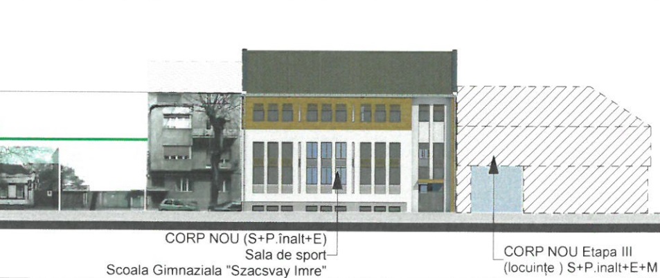 În această etapă e propus un corp nou de clădire pentru Școala Gimnazială Szacsvay Imre: un imobil care să adăpostească sala de sport a școlii, cu acces din curte și cu fațadă spre Roman Ciorogariu, aliniată la clădirea cu etaj din imediata vecinătate.