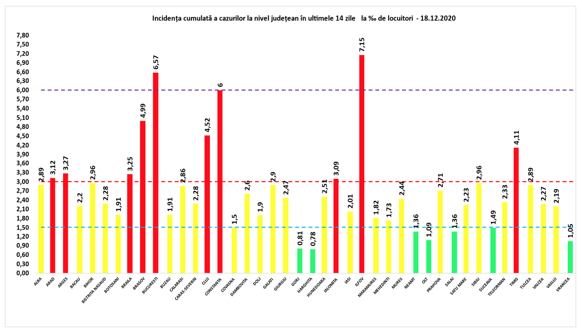 Coeficientul infectărilor cumulate la 14 zile, raportate la 1.000 de locuitori este calculat de către Direcțiile de Sănătate Publică, la nivelul Municipiului București și al județelor. Mai jos aveți graficul realizat în baza raportărilor primite de CNCCI de la Direcțiile de Sănătate Publică: