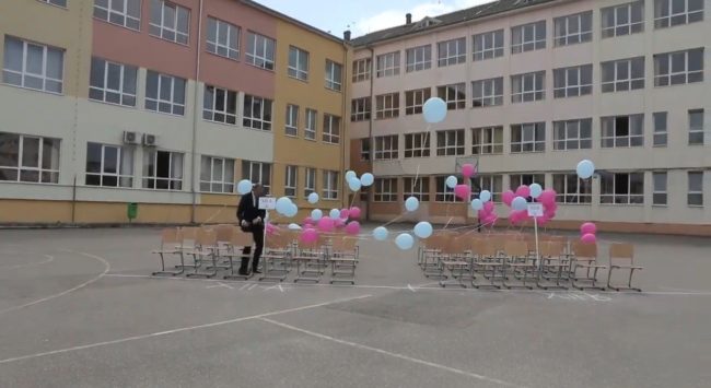Astfel că, vineri la ora 10:00 , atunci când curtea școlii trebuia să fie plină de copii, de absolvenți cu vise, părinți emoționați și de dascăli cu lacrimi discrete în ochi, directorul Marcel Sas Emil Adascăliții a apărut singur, într-o transmise live, la pupitrul amenajat în curtea școlii, în fața scaunelor goale, oferind o imagine simbolică, care seamă izbitor cu cea oferită de Papa vorbind singur de Paște, în piața goală.