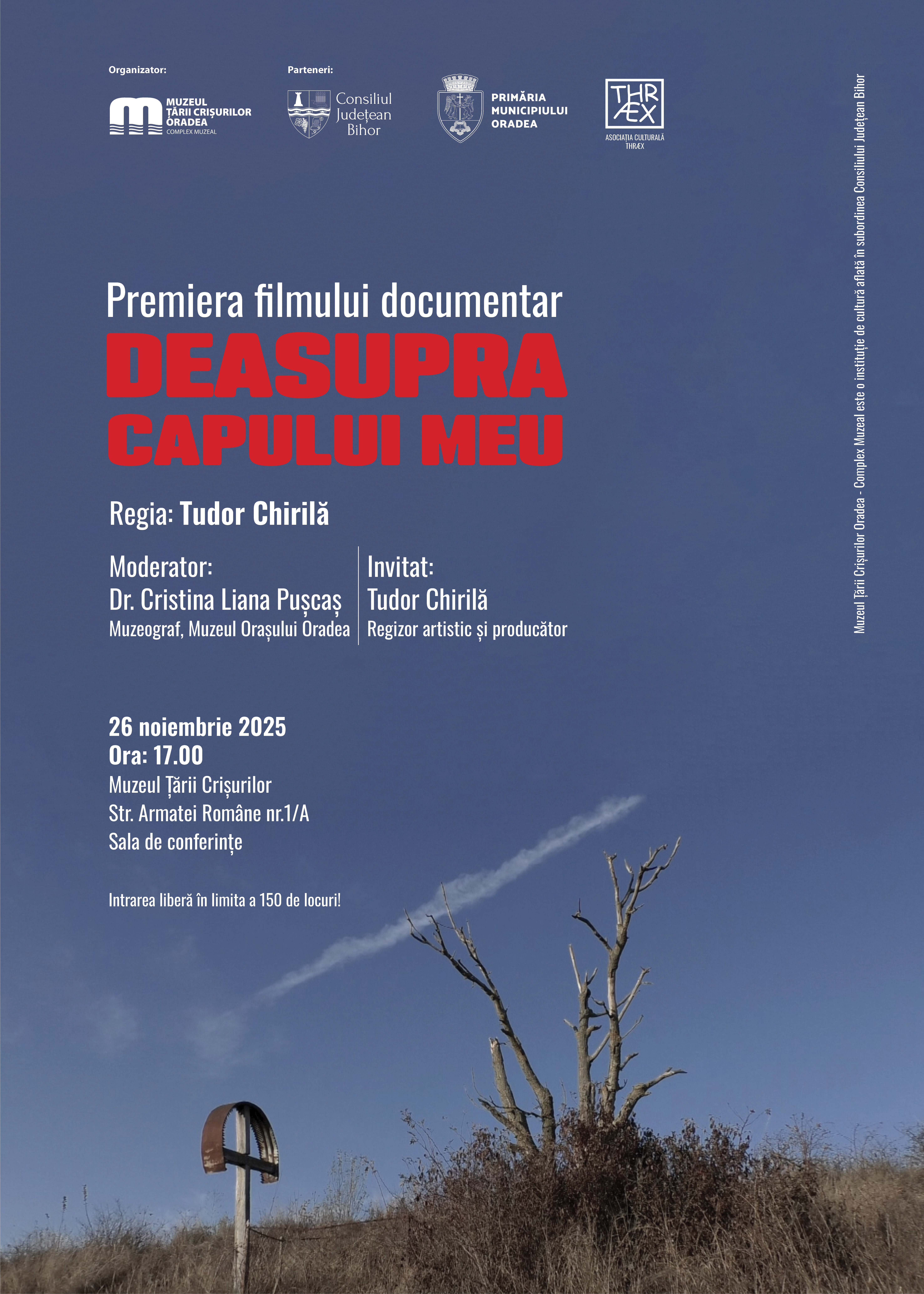 La Oradea va avea loc premiera filmului documentar „Deasupra capului meu”, regizor și producător Tudor Chirilă. Proiecția va avea loc miercuri, 26 noiembrie, ora 17:00, în Sala de conferințe a Muzeului Țării Crișurilor (Str. Armatei Române nr.1/A).
